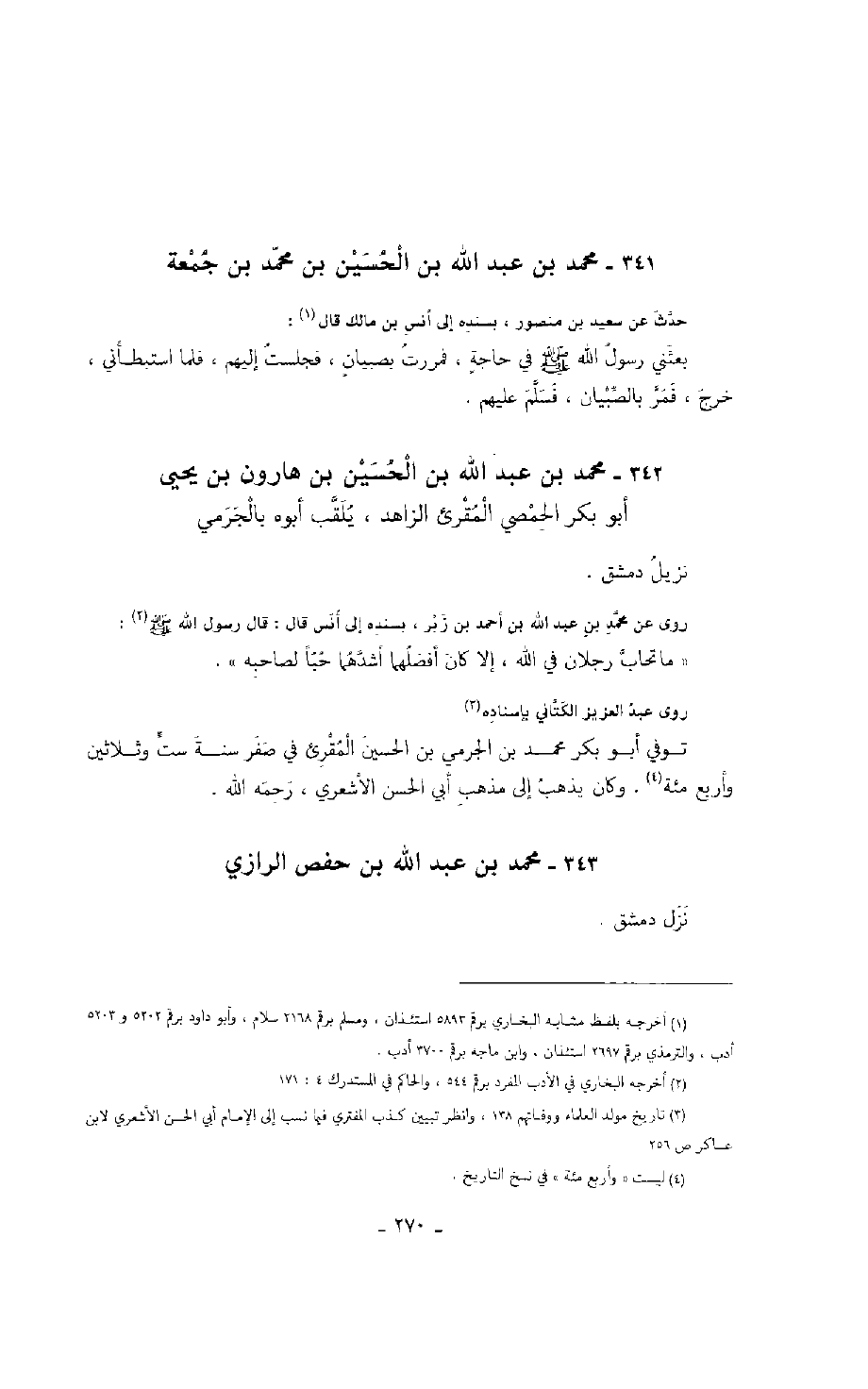 ابن محمد بن جمعة حدث عن سعيد بن منصور، بسنده إلى أنس بن مالك قال: بعثني رسول الله صَلَّى اللهُ عَلَيْهِ وَسَلَّمَ في حاجة، فمررت بصبيان، فجلست إليهم، فلما استبطأني، خرج، فمر بالصبيان، فسلم عليهم.