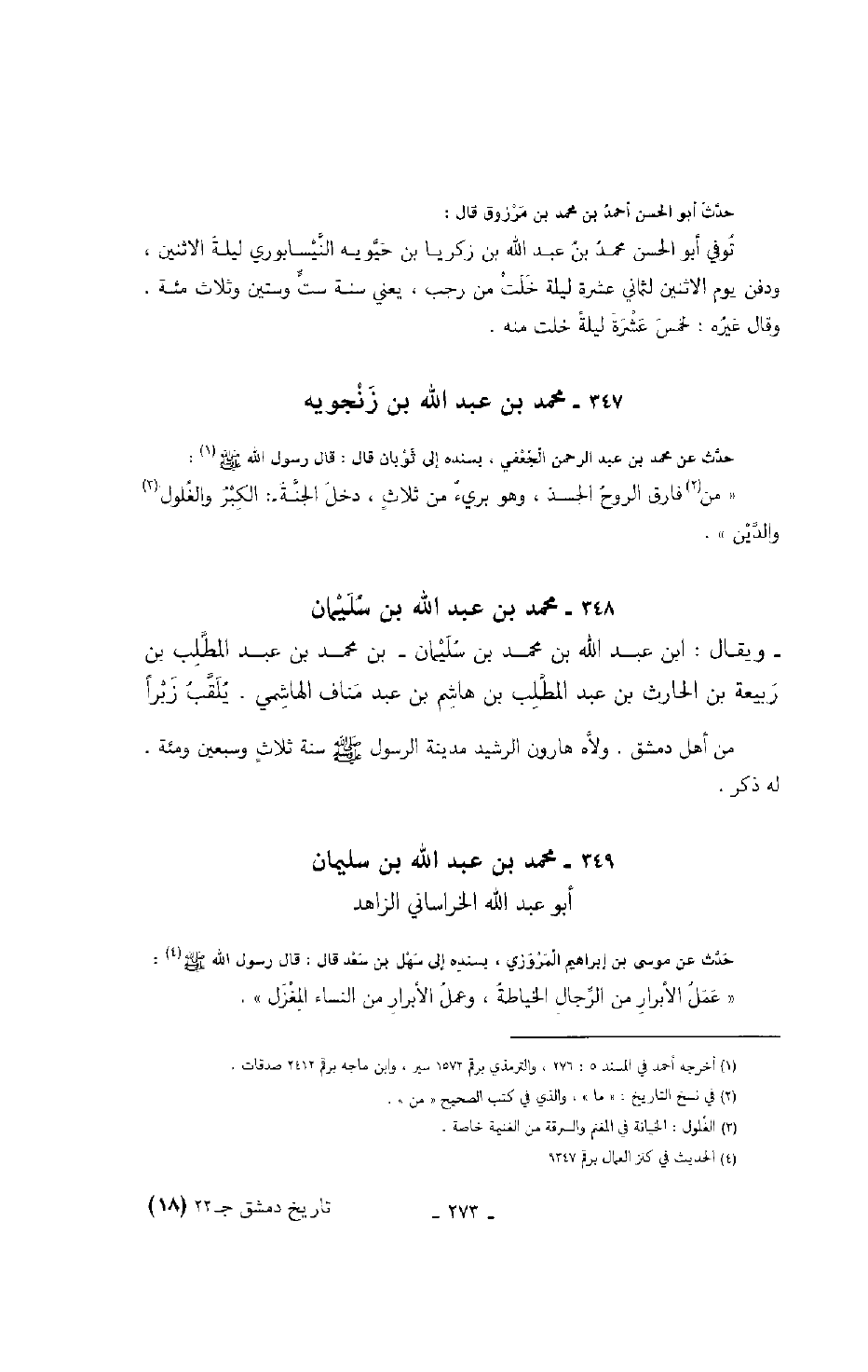 حدث عن محمد بن عبد الرحمن الجعفي، بسنده إلى ثوبان قال: قال رسول الله صَلَّى اللهُ عَلَيْهِ وَسَلَّمَ: " من فارق الروح الجسد، وهو بريء من ثلاث، دخل الجنة: الكبر والغلول والدين ".