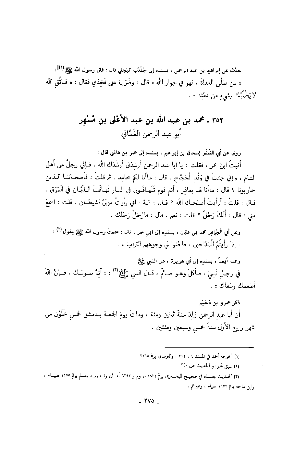 حدث عن إبراهيم بن عبد الرحمن، بسنده إلى جندب البجلي قال: قال رسول الله صَلَّى اللهُ عَلَيْهِ وَسَلَّمَ: " من صلى الغداة، فهو في جوار الله " قال: وضرب على فخذي فقال: " فاتق الله لا يطلبك بشيء من ذمته ".