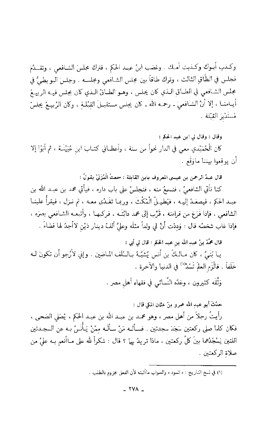 وكذب أبوك وكذبت أمك. وغضب ابن عبد الحكم، فترك مجلس الشافعي، وتقدم فجلس في الطاق الثالث، وترك طاقاً بين مجلس الشافعي ومجلسه. وجلس البويطي في مجلس الشافعي في الطاق الذي كان يجلس، وهو الطاق الذي كان يجلس فيه الربيع أيامنا، إلا أن الشافعي - رحمه الله - كان يجلس مستقبل القبلة، وكان الربيع يجلس مستدبر القبلة.