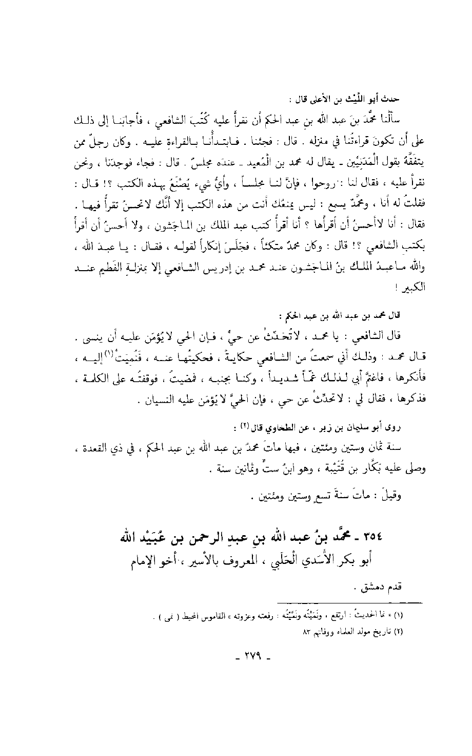 سألنا محمد بن عبد الله بن عبد الحكم أن تقرأ عليه كتب الشافعي، فأجابنا إلى ذلك على أن تكون قراءتنا في منزله. قال: فجئنا. فابتدأنا بالقراءة عليه. وكان رجل ممن يتفقه بقول المدنيين - يقال له محمد بن المعيد - عنده مجلس. قال: فجاء فوجدنا، ونحن نقرأ عليه، فقال لنا: روحوا، فإن لنا مجلساً، وأي شيء يصنع بهذه الكتب؟! قال: فقلت له أنا، ومحمد يسمع: ليس يمنعك أنت من هذه الكتب إلا أنك لا تحسن تقرأ فيها. فقال: أنا لا أحسن أن أقرأها؟ أنا أقرأ كتب عبد الملك بن الماجثون، ولا حسن أن أقرأ بكتب الشافعي؟! قال: وكان محمد متكئاً، فجلس إنكاراً لقوله، فقال: يا عبد الله، والله ما عبد الملك بن الماجثون عند محمد بن إدريس الشافعي إلا بمنزلة الفطيم عند الكبير! قال محمد بن عبد الله بن عبد الحكم: قال الشافعي: يا محمد، لا تحدث عن حي، فإن الحي لا يؤمن عليه أن ينسى. قال محمد: وذلك أني سمعت من الشافعي حكاية، فحكيتها عنه، فنميت إليه، فأنكرها، فاغتم أبي لذلك غماً شديداً، وكنا بجنبه، فمضيت، فوقفته على الكلمة، فذكرها، فقال لي: لا تحدث عن حي، فإن الحي لا يؤمن عليه النسيان.