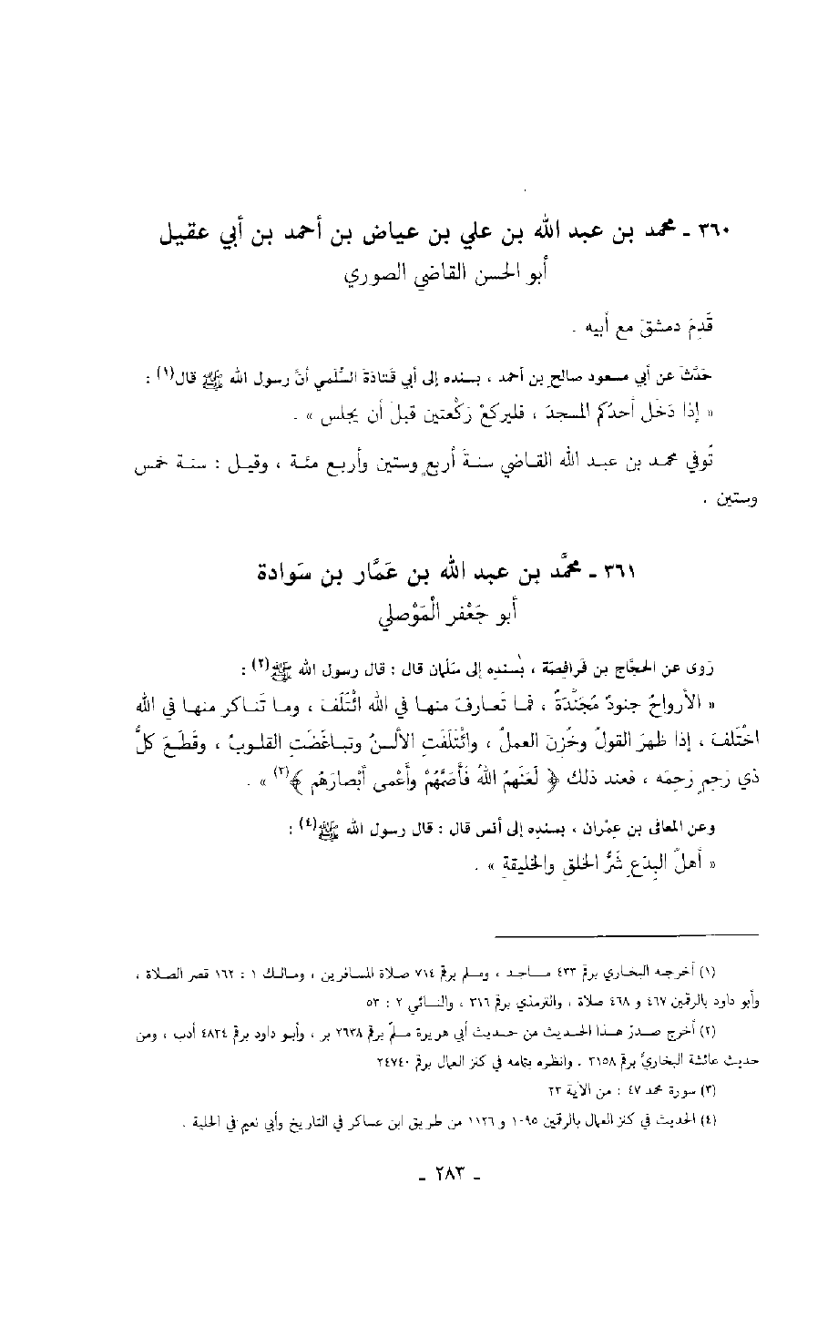 أبو جعفر الموصلي روى عن الحجاج بن فرافصة، بسنده إلى سلمان قال: قال رسول الله صَلَّى اللهُ عَلَيْهِ وَسَلَّمَ: " الأرواح جنود مجندة، فما تعارف منها في الله ائتلف، وما تناكر منها في الله اختلف، إذا ظهر القول وخزن العمل، وائتلفت الألسن وتباغضت القلوب، وقطع كل ذي رحم رحمه فعند ذلك " لعنهم الله فأصمهم وأعمى أبصارهم " ".
