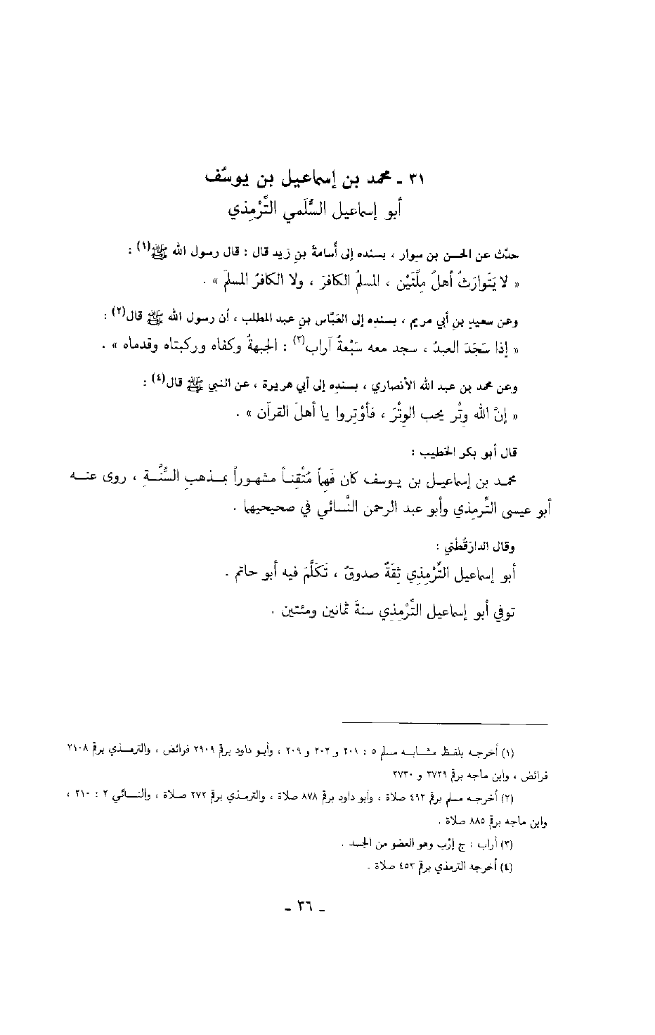 محمد بن إسماعيل بن يوسف أبو إسماعيل السلمي الترمذي حدث عن الحسن بن سوار، بسنده إلى أسامة بن زيد قال: قال رسول الله صَلَّى اللهُ عَلَيْهِ وَسَلَّمَ: " لا يتوارث أهل ملتين، المسلم الكافر، ولا الكافر المسلم ".
