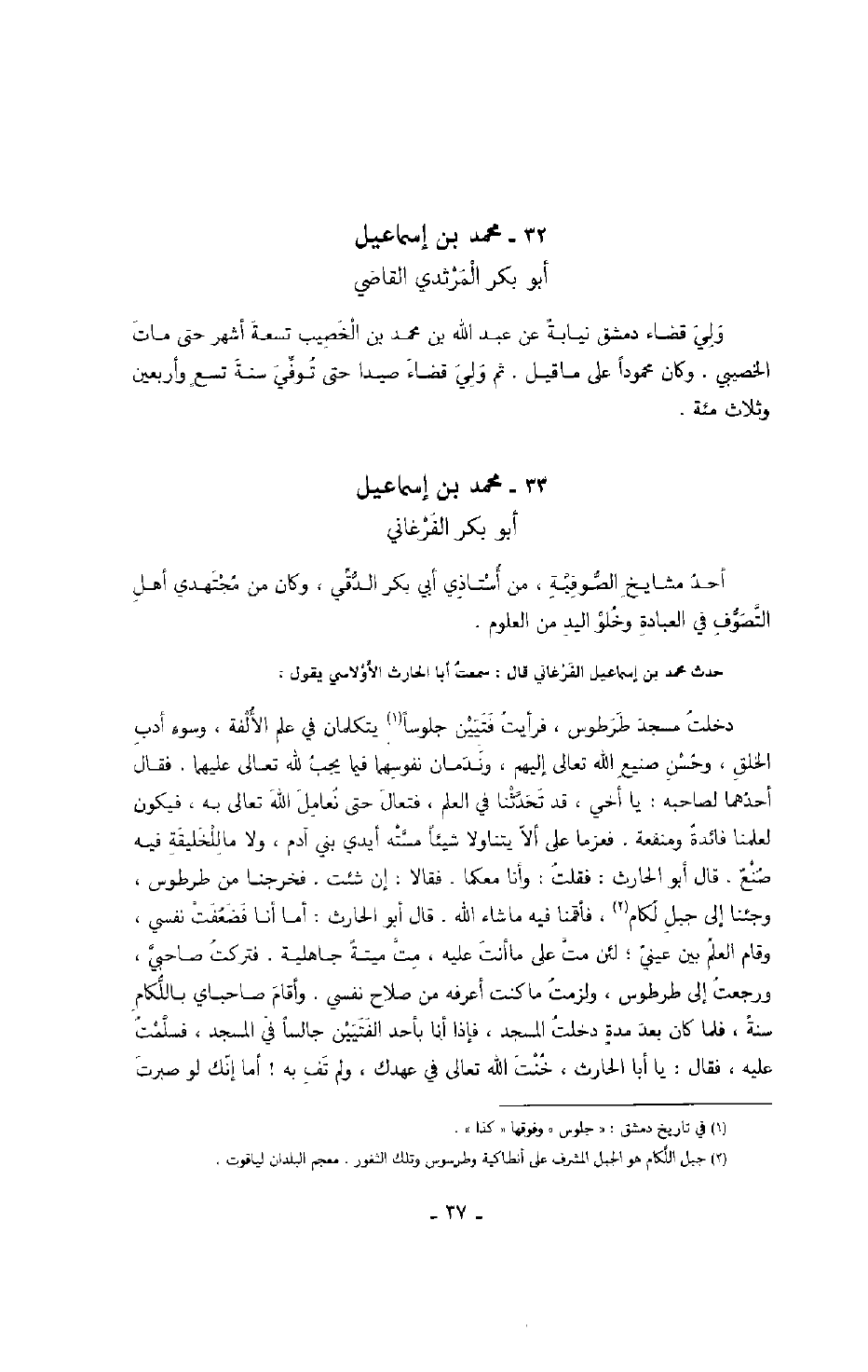 حدث محمد بن إسماعيل الفرغاني قال: سمعت أبا الحارث الأولاسي يقول: دخلت مسجد طرطوس، فرأيت فتيين جلوساً يتكلمان في علم الألفة، وسوء أدب الخلق، وحسن صنيع الله تعالى إليهم، وندمان نفوسهما فيما يجب لله تعالى عليهما. فقال أحدهما لصاحبه: يا أخي، قد تحدثنا في العلم، فتعال حتى نعامل الله تعالى به، فيكون لعلمنا فائدة ومنفعة. فعزما على ألا يتناولا شيئاً مسته أيدي بني آدم، ولا ما للخليقة فيه صنع. قال أبو الحارث: فقلت: وأنا معكما. فقالا: إن شئت. فخرجنا من طرطوس، وجئنا إلى جبل لكام، فأقمنا فيه ما شاء الله. قال أبو الحارث: أما أنا فضعفت نفسي، وقام العلم بين عيني؛ لئن مت على ما أنت عليه، مت ميتة جاهلية. فتركت صاحبي، ورجعت إلى طرطوس، ولزمت ما كنت أعرفه من صلاح نفسي. وأقام صاحباي باللكام سنة، فلما كان بعد مدة دخلت المسجد، فإذا أنا بأحد الفتيين جالساً في المسجد، فسلمت عليه، فقال: يا أبا الحارث، خنت الله تعالى في عهدك، ولم تف به! أما إنك لو صبرت