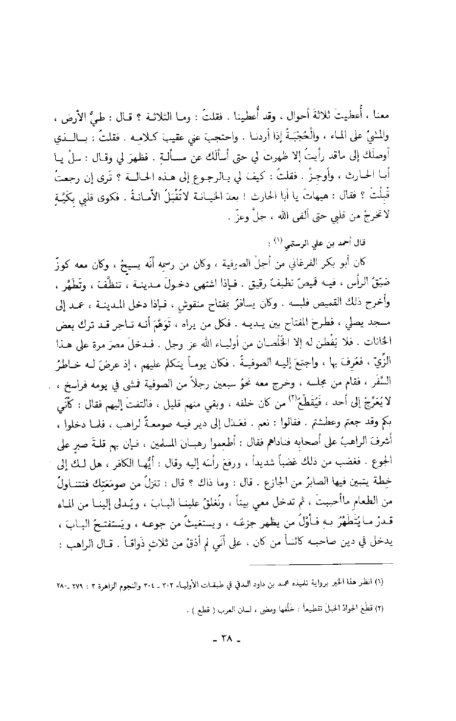 معنا، أعطيت ثلاثة أحوال، وقد أعطينا. فقلت: وما الثلاثة؟ قال: طي الأرض، والمشي على الماء، والحجبة إذا أردنا. واحتجب عني عقيب كلامه. فقلت: بالذي أوصلك إلى ما قد رأيت إلا ظهرت لي حتى أسألك عن مسألة. فظهر لي وقال: سل يا أبا الحارث، وأوجز. فقلت: كيف لي بالرجوع إلى هذه الحالة؟ ترى إن رجعت قبلت؟ فقال: هيهات يا أبا الحارث! بعد الخيانة لا تقبل الأمانة. فكوى قلبي بكية لا تخرج من قلبي حتى ألقى الله، جل وعز.