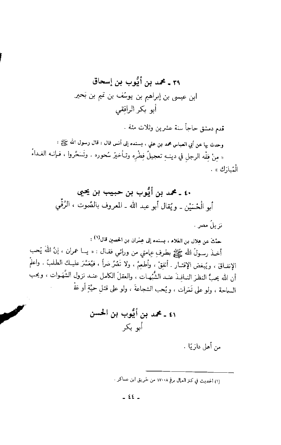 حدث عن هلال بن العلاء، بسنده إلى عمران بن الحصين قال: أخذ رسول الله صَلَّى اللهُ عَلَيْهِ وَسَلَّمَ بطرف عمامتي من ورائي فقال: " يا عمران، إن الله يحب الإنفاق، ويبغض الإقتار. أنفق، وأطعم، ولا تصر صراً، فيعسر عليك الطلب، واعلم أن الله يحب النظر النافذ عند الشبهات، والعقل الكامل عند نزول الشهوات، ويحب السماحة، ولو على تمرات، ويحب الشجاعة، ولو على قتل حية أو عقرب ".