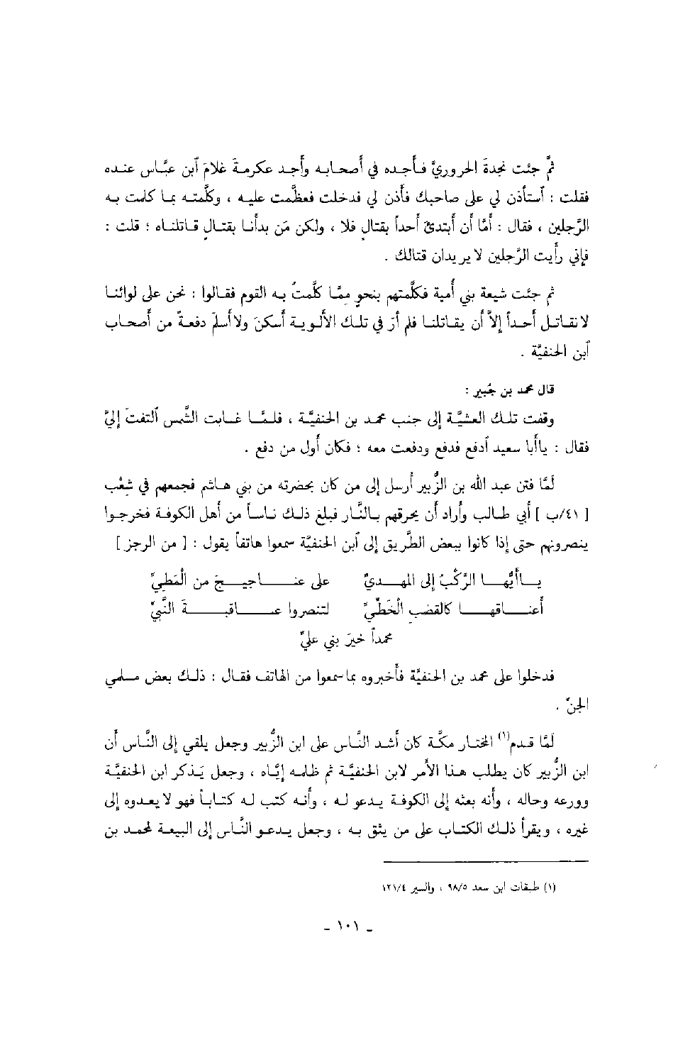 لما فتن عبد الله بن الزبير أرسل إلى من كان بحضرته من بني هاشم فجمعهم في شعب أبي طالب وأراد أن يحرقهم بالنار ذلك ناساً من أهل الكوفة فخرجوا ينصرونهم حتى إذا كانوا ببعض الطريق إلى ابن الحنفية سمعوا هاتفاً يقول: من الرجز
