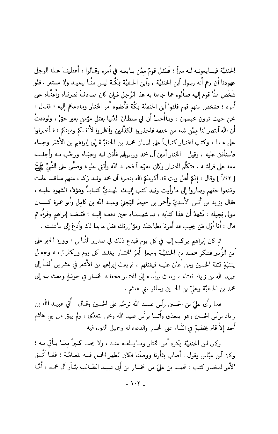 الحنفية فيبايعونه له سراً؛ فسئل قومٌ ممن بايعه في أمره وقالوا: أعطينا هذا الرجل عهودنا أن زعم أنه رسول ابن الحنفية، وابن الحنفية بمكة ليس منا ببعيد ولا مستتر، فلو شخص منا قوم إليه فسألوه عما جاءنا به هذا الرجل فإن كان صادقاً نصرناه وأعناه على أمره؛ فشخص منهم قوم فلقوا ابن الحنفية بمكة فأعلموه أمر المختار وما دعاهم إليه؛ فقال: نحن حيث ترون محبسون، وما أحب أن لي سلطان الدنيا بقتل مؤمنٍ بغير حق، ولوددت أن الله انتصر لنا ممن شاء من خلقه فاحذروا الكذابين وانظروا لأنفسكم ودينكم؛ فانصرفوا على هذا، وكتب المختار كتاباً على لسان محمد بن الحنفية إلى إبراهيم بن الأشتر وجاء فاستأذن عليه، وقيل: المختار أمين آل محمد ورسولهم فأذن له وحياه ورحب به وأجلسه معه على فراشه، فتكلم المختار وكان مفوهاً فحمد الله وأثنى عليه وصلى على النبي صَلَّى اللهُ عَلَيْهِ وَسَلَّمَ وقال: إنكم أهل بيت قد أكرمكم الله بنصرة آل محمد وقد ركب منهم ما قد علمت ومنعوا حقهم وصاروا إلى ما رأيت وقد كتب إليك المهدي كتاباً وهؤلاء الشهود عليه، فقال يزيد بن أنس الأسدي وأحمر بن سميط البجلي وعبد الله بن كامل وأبو عمرة كيسان مولى بجيلة: نشهد أن هذا كتابه، قد شهدناه حين دفعه إليه؛ فقبضه إبراهيم وقرأه ثم قال: أنا أول من يجيب قد أمرنا بطاعتك ومؤازرتك فقل ما بدا لك وادع إلى ما شئت.