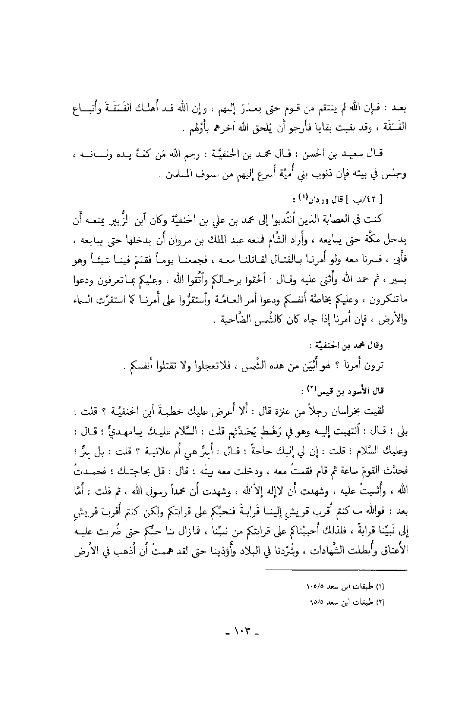 قال سعيد بن الحسن: قال محمد بن الحنفية: رحم الله من كف يده ولسانه، وجلس في بيته فإن ذنوب بني أمية أسرع إليهم من سيوف المسلمين.