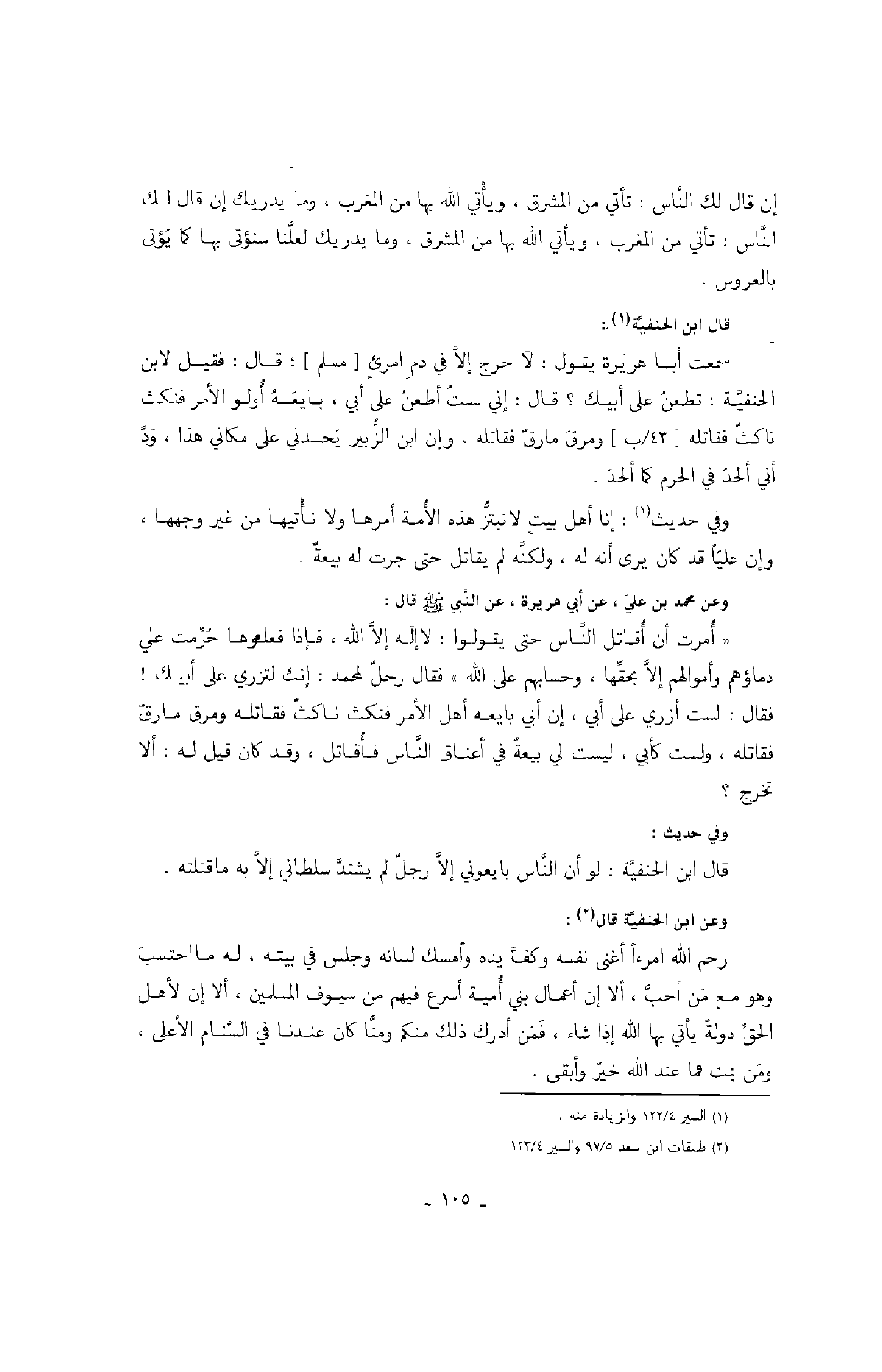 وعن محمد بن علي، عن أبي هريرة، عن النبي صَلَّى اللهُ عَلَيْهِ وَسَلَّمَ قال: " أمرت أن أقاتل الناس حتى يقولوا: لا إله إلا الله، فإذا فعلوها حرمت علي دماؤهم وأموالهم إلا بحقها، وحسابهم على الله " فقال رجلٌ لمحمد: إنك لتزري على أبيك فقال: لست أزري على أبي، إن أبي بايعه أهل الأمر فنكث ناكثٌ فقاتله ومرق مارقٌ فقاتله، ولست كأبي، ليست لي بيعةٌ في أعناق الناس فأقاتل، وقد كان قيل له: ألا تخرج؟ وفي حديث: قال ابن الحنفية: لو أن الناس بايعوني إلا رجلٌ لم يشتد سلطاني إلا به ما قتلته.