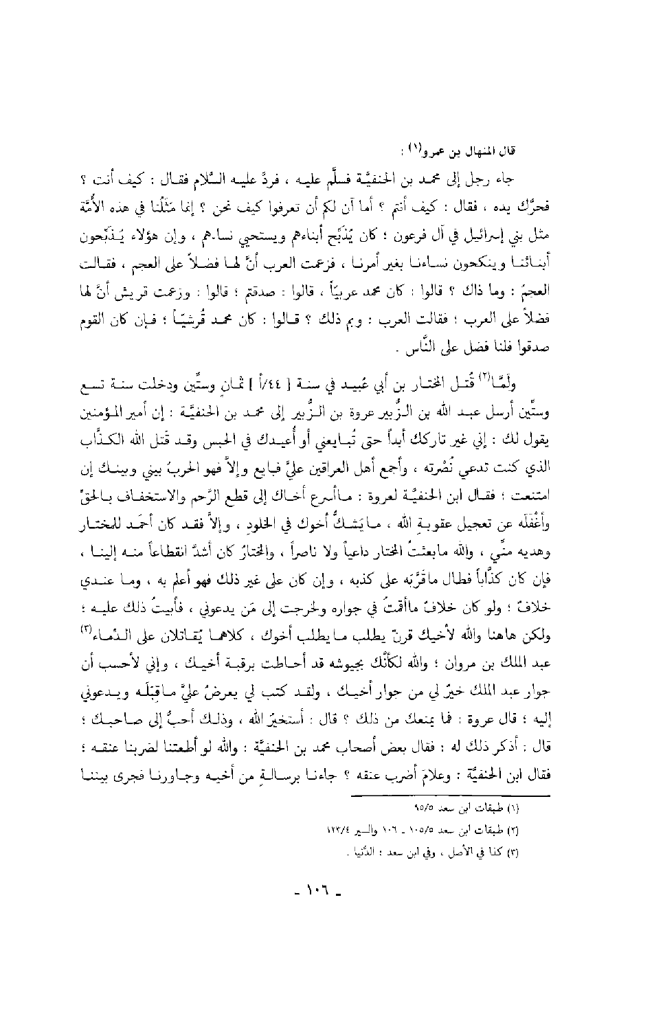 جاء رجل إلى محمد بن الحنفية فسلم عليه، فرد عليه السلام فقال: كيف أنت؟ فحرك يده، فقال: كيف أنتم؟ أما آن لكم أن تعرفوا كيف نحن؟ إنما مثلنا في هذه الأمة مثل بني إسرائيل في آل فرعون؛ كان يذبح أبناءهم ويستحيي نساءهم، وإن هؤلاء يذبحون أبنائنا وينكحون نساءنا بغير أمرنا، فزعمت العرب أن لها فضلاً على العجم، فقالت العجم: وما ذاك؟ قالوا: كان محمد عربياً، قالوا: صدقتم؛ قالوا: وزعمت قريش أن لها فضلاً على العرب؛ فقالت العرب: وبم ذلك؟ قالوا: كان محمد قرشياً؛ فإن كان القوم صدقوا فلنا فضل على الناس.