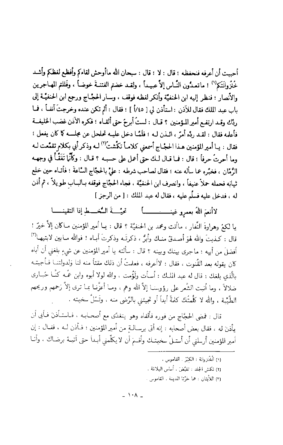 أحببت أن أعرفه فنحفظه؛ قال: لا؛ قال: سبحان الله ما أوحش لقاءكم وأفظع لفظكم وأشد خنزوانتكم ما تعدون الناس إلا عبيداً، ولقد خضتم الفتنة خوضاً، وفللتم المهاجرين والأنصار؛ فنظر إليه ابن الحنفية وأنكر لفظه فوقف، وسار الحجاج ورجع ابن الحنفية إلى باب عبد الملك فقال للآذن: استأذن لي؛ فقال: ألم تكن عنده وخرجت آنفاً، فما ردك وقد ارتفع أمير المؤمنين؟ قال: لست أبرح حتى ألقاه؛ فكره لآذن غضب الخليفة فأعلمه فقال: لقد رده أمرٌ، ائذن له؛ فلما دخل عليه تحلحل عن مجلسه كما كان يفعل؛ فقال: يا أمير المؤمنين هذا الحجاج أسمعني كلاماً تكمشت له وذكر أبي بكلامٍ تقمعت له وما أحرت حرفاً؛ قال: فما قال لك حتى أعمل على حسبه؟ قال: وكأنما تفقأ في وجهه الرمان، فخبره عما سأله عنه؛ فقال لصاحب شرطه: علي بالحجاج الساعة؛ فأتاه حين خلع ثيابه فحمله حملاً عنيفاً، وانصرف ابن الحنفية، فجاء الحجاج فوقفه بالباب طويلاً، ثم أذن له، فدخل عليه فسلم عليه، فقال له عبد الملك: من الرجز