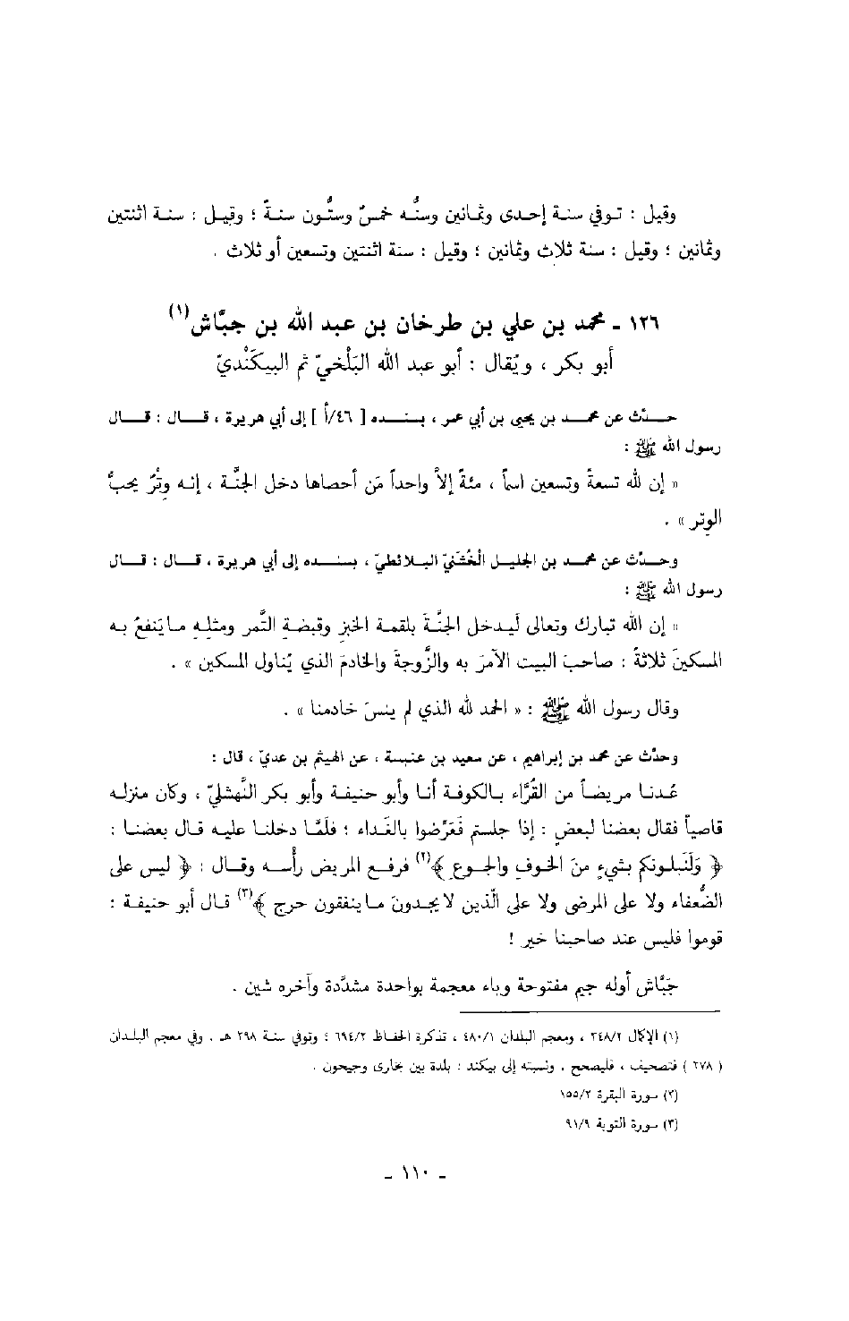 وحدث عن محمد بن الجليل الخشني البلائطي، بسنده إلى أبي هريرة، قال: قال رسول الله صَلَّى اللهُ عَلَيْهِ وَسَلَّمَ: " إن الله تبارك وتعالى ليدخل الجنة بلقمة الخبز وقبضة التمر ومثله ما ينفع به المسكين ثلاثةً: صاحب البيت الآمر به والزوجة والخادم الذي يناول المسكين ".