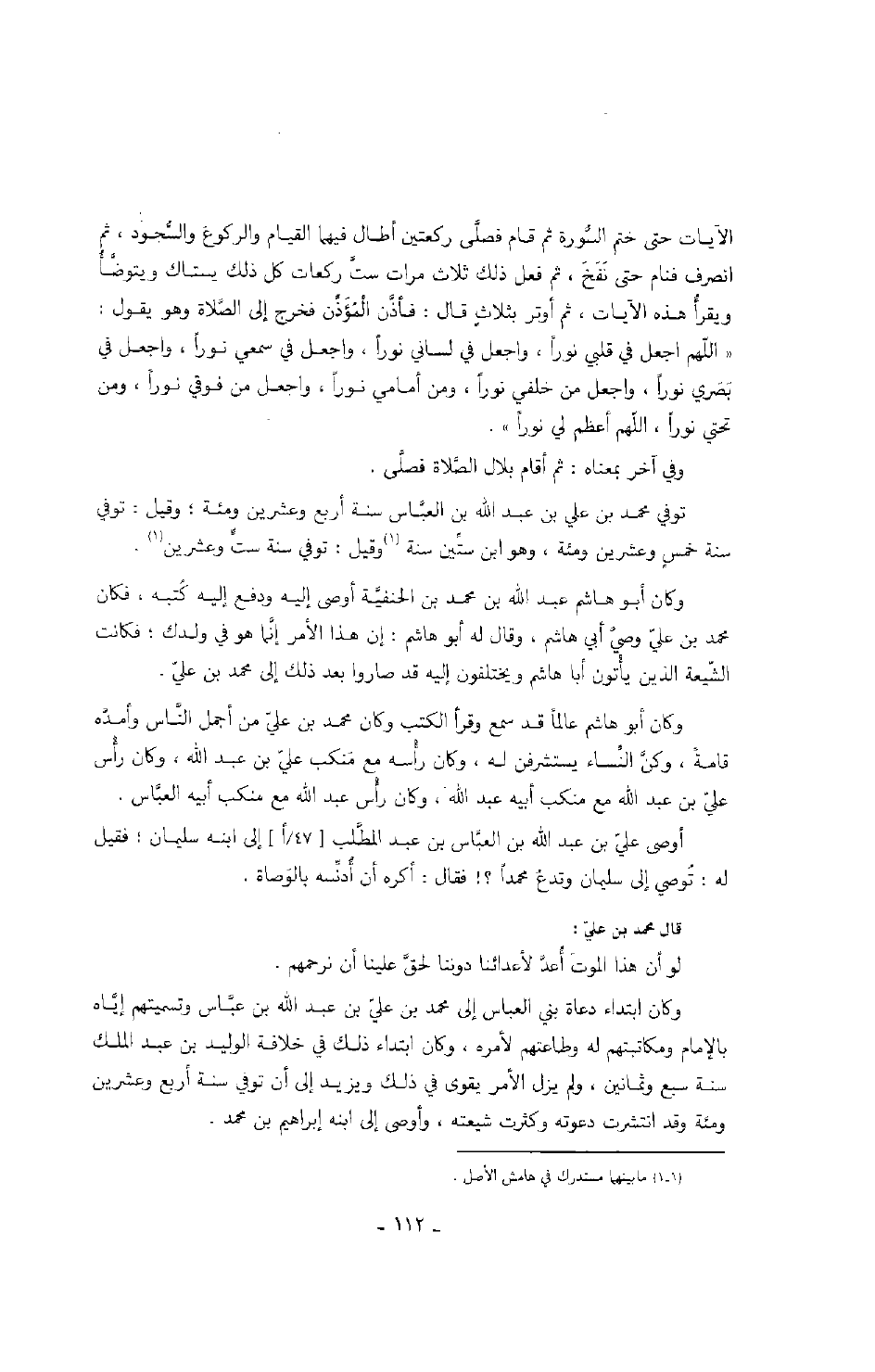 وكان ابتداء دعاة بني العباس إلى محمد بن علي بن عبد الله بن عباس وتسميتهم إياه بالإمام ومكاتبتهم له وطاعتهم لأمره، وكان ابتداء ذلك في خلافة الوليد بن عبد الملك سنة سبع وثمانين، ولم يزل الأمر يقوى في ذلك ويزيد إلى أن توفي سنة أربع وعشرين ومئة وقد انتشرت دعوته وكثرت شيعته، وأوصى إلى ابنه إبراهيم بن محمد.