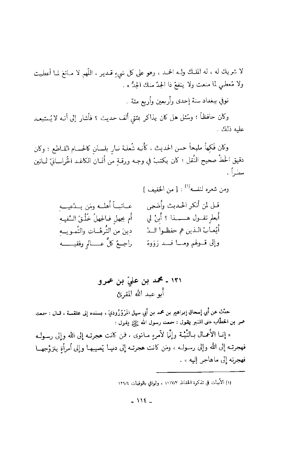 أبو عبد الله المقرئ حدث عن أبي إسحاق لإبراهيم بن محمد بن أبي سهل المروروذي، بسنده إلى علقمة، قال: سمعت عمر بن الخطاب على المنبر يقول: سمعت رسول الله صَلَّى اللهُ عَلَيْهِ وَسَلَّمَ يقول: " إنما الأعمال بالنية وإنما لامرءٍ ما نوى، فمن كانت هجرته إلى الله ورسوله فهجرته إلى الله ورسوله، ومن كانت هجرته إلى دنيا يصيبها وإلى امرأةٍ يتزوجها فهجرته إلى ما هاجر إليه ".