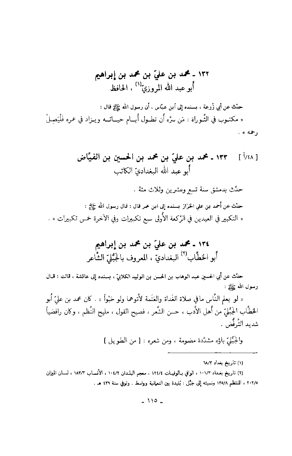 حدث عن أحمد بن علي الخراز بسنده إلى ابن عمر قال: قال رسول الله صَلَّى اللهُ عَلَيْهِ وَسَلَّمَ: " التكبير في العيدين في الركعة الأولى سبع تكبيرات وفي الآخرة خمس تكبيرات ".