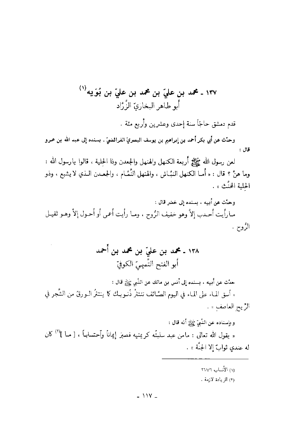 وحدث عن أبي بكر أحمد بن إبراهيم بن يوسف البصري الفرائضي، بسنده إلى عبد الله بن عمرو قال: لعن رسول الله صَلَّى اللهُ عَلَيْهِ وَسَلَّمَ أربعة الكنهل والهنهل والجعدن وذا الحلية، قالوا يا رسول الله: وما هن؟ قال: " أما الكنهل النباش، والهنهل النمام، والجعدن الذي لا يشبع، وذو الحلية المخنث ".