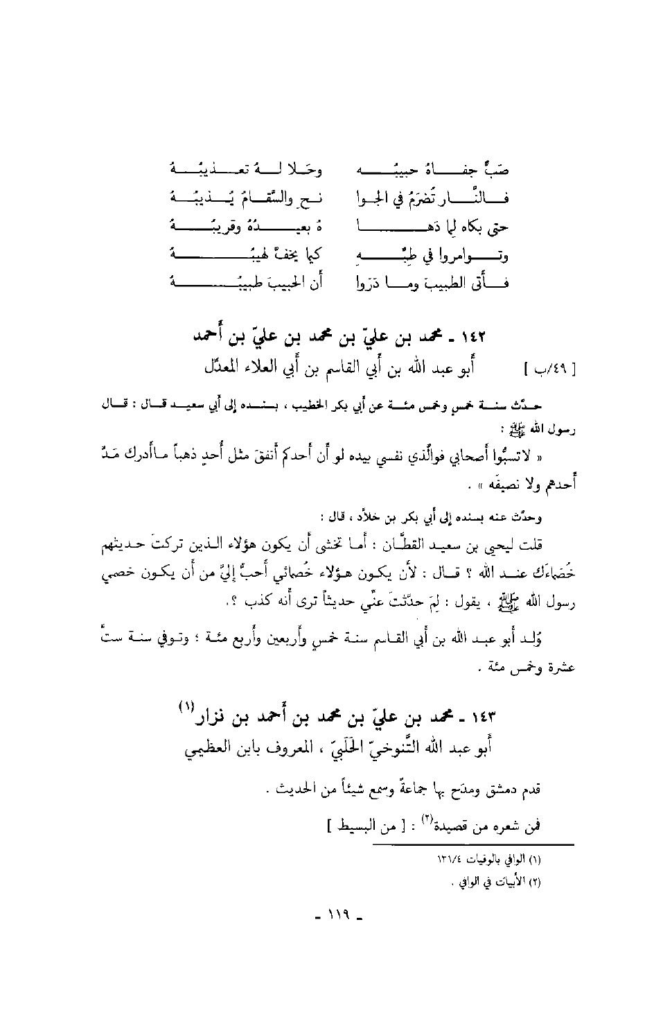 ابن أحمد أبو عبد الله بن أبي القاسم بن أبي العلاء المعدل حدث سنة خمسٍ وخمس مئة عن أبي بكر الخطيب، بسنده إلى أبي سعيد قال: قال رسول الله صَلَّى اللهُ عَلَيْهِ وَسَلَّمَ: " لا تسبوا أصحابي فوالذي نفسي بيده لو أن أحدكم أنفق مثل أحدٍ ذهباً ما أدرك مد أحدكم ولا نصيفه ".