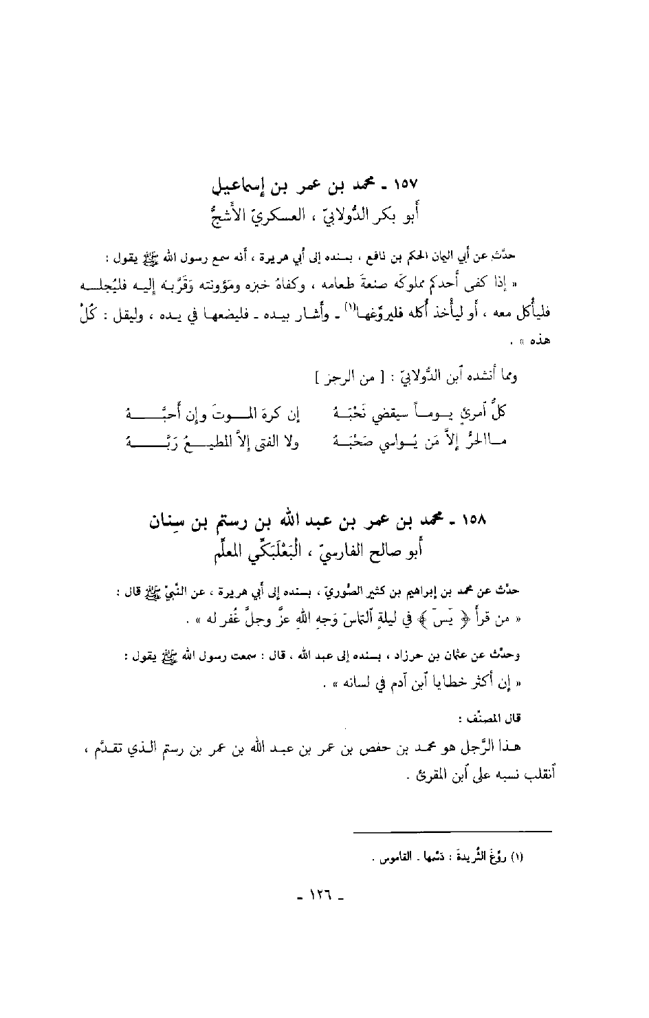 أبو بكر الدولابي، العسكري الأشج حدث عن أبي اليمان الحكم بن نافع، بسنده إلى أبي هريرة، أنه سمع رسول الله صَلَّى اللهُ عَلَيْهِ وَسَلَّمَ يقول: " إذا كفى أحدكم مملوكه صنعة طعامه، وكفاه خبزه ومؤونته وقربه إليه فليجلسه فليأكل معه، أو ليأخذ أكله فليروغها وأشار بيده فليضعها في يده، وليقل: كل هذه ".