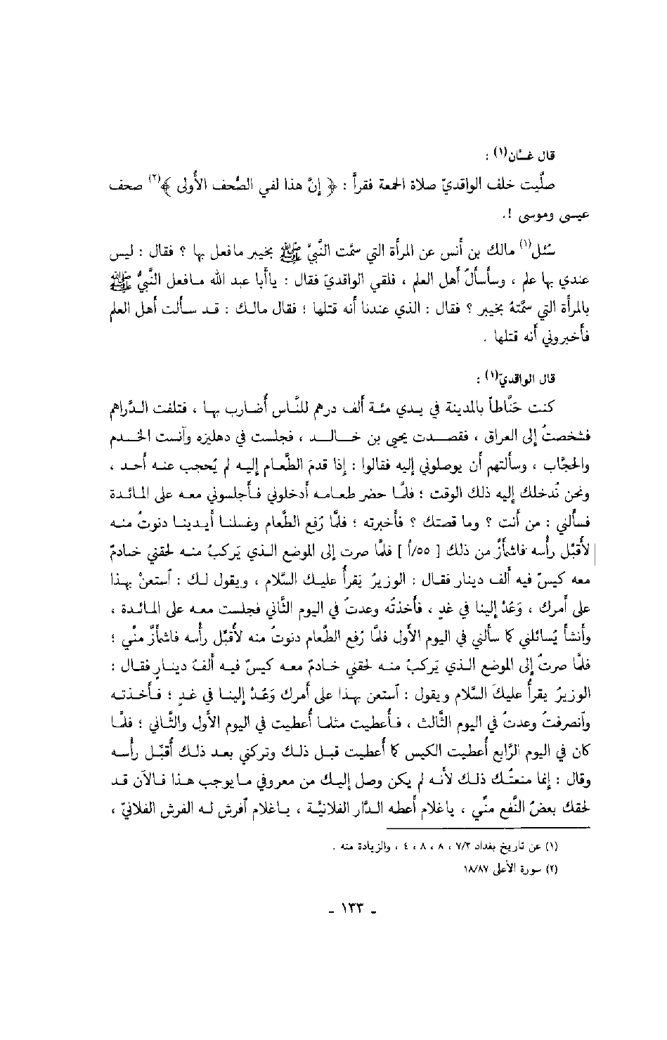 قال غسان: صليت خلف الواقدي صلاة الجمعة فقرأ: " إن هذا لفي الصحف الأولى " صحف عيسى وموسى.