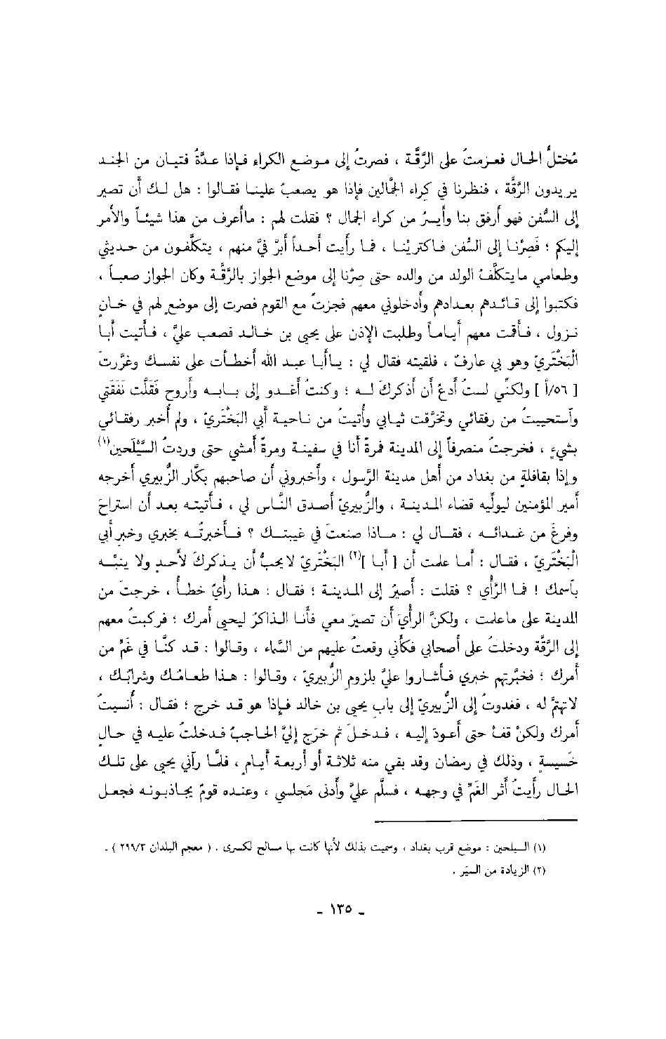 مختل الحال فعزمت على الرقة، فصرت إلى موضع الكراء فإذا عدة فتيان من الجند يريدون الرقة، فنظرنا في كراء الجمالين فإذا هو يصعب علينا فقالوا: هل لك أن تصير إلى السفن فهو أرفق بنا وأيسر من كراء الجمل؟ فقلت لهم: ما أعرف من هذا شيئاً والأمر إليكم؛ فصرنا إلى السفن فاكترينا، فما رأيت أحداً أبر في منهم، يتكلفون من حديثي وطعامي ما يتكلف الولد من والده حتى صرنا إلى موضع الجواز بالرقة وكان الجواز صعباً، فكتبوا إلى قائدهم بعدادهم وأدخلوني معهم فجزت مع القوم فصرت إلى موضعٍ لهم في خانٍ نزول، فأقمت معهم أياماً وطلبت الإذن على يحيى بن خالد فصعب علي، فأتيت أبا البختري وهو بي عارفٌ، فلقيته فقال لي: يا أبا عبد الله أخطأت على نفسك وغررت ولكني لست أدع أن أذكرك له؛ وكنت أغدو إلى بابه وأروح فقلت نفقتي واستحييت من رفقائي وتخرقت ثيابي وأتيت من ناحية أبي البختري، ولم أخبر رفقائي بشيءٍ، فخرجت منصرفاً إلى المدينة فمرةً أنا في سفينة ومرةً أمشي حتى وردت السيلحين وإذا بقافلةٍ من بغداد من أهل مدينة الرسول، وأخبروني أن صاحبهم بكار الزبيري أخرجه أمير المؤمنين ليوليه قضاء المدينة، والزبيري أصدق الناس لي، فأتيته بعد أن استراح وفرغ من غدائه، فقال لي: ماذا صنعت في غيبتك؟ فأخبرته بخبري وخبر أبي البختري، فقال: أما علمت أن أبا البختري لا يحب أن يذكرك لأحدٍ ولا ينبه باسمك فما الرأي؟ فقلت: أصير إلى المدينة؛ فقال: هذا رأيٌ خطأ، خرجت من المدينة على ما علمت، ولكن الرأي أن تصير معي فأنا الذاكر ليحيى أمرك؛ فركبت معهم إلى الرقة ودخلت على أصحابي فكأني وقعت عليهم من السماء، وقالوا: قد كنا في غم من أمرك؛ فخبرتهم خبري فأشاروا علي بلزوم الزبيري، وقالوا: هذا طعامك وشرابك، لا تهتم له، فغدوت إلى الزبيري إلى باب يحيى بن خالد فإذا هو قد خرج؛ فقال: أنسيت أمرك ولكن قف حتى أعود إليه، فدخل ثم خرج إلي الحاجب فدخلت عليه في حالٍ خسيسةٍ، وذلك في رمضان وقد بقي منه ثلاثة أو أربعة أيامٍ، فلما رآني يحيى على تلك الحال رأيت أثر الغم في وجهه، فسلم علي وأدنى مجلسي، وعنده قومٌ يجاذبونه فجعل
