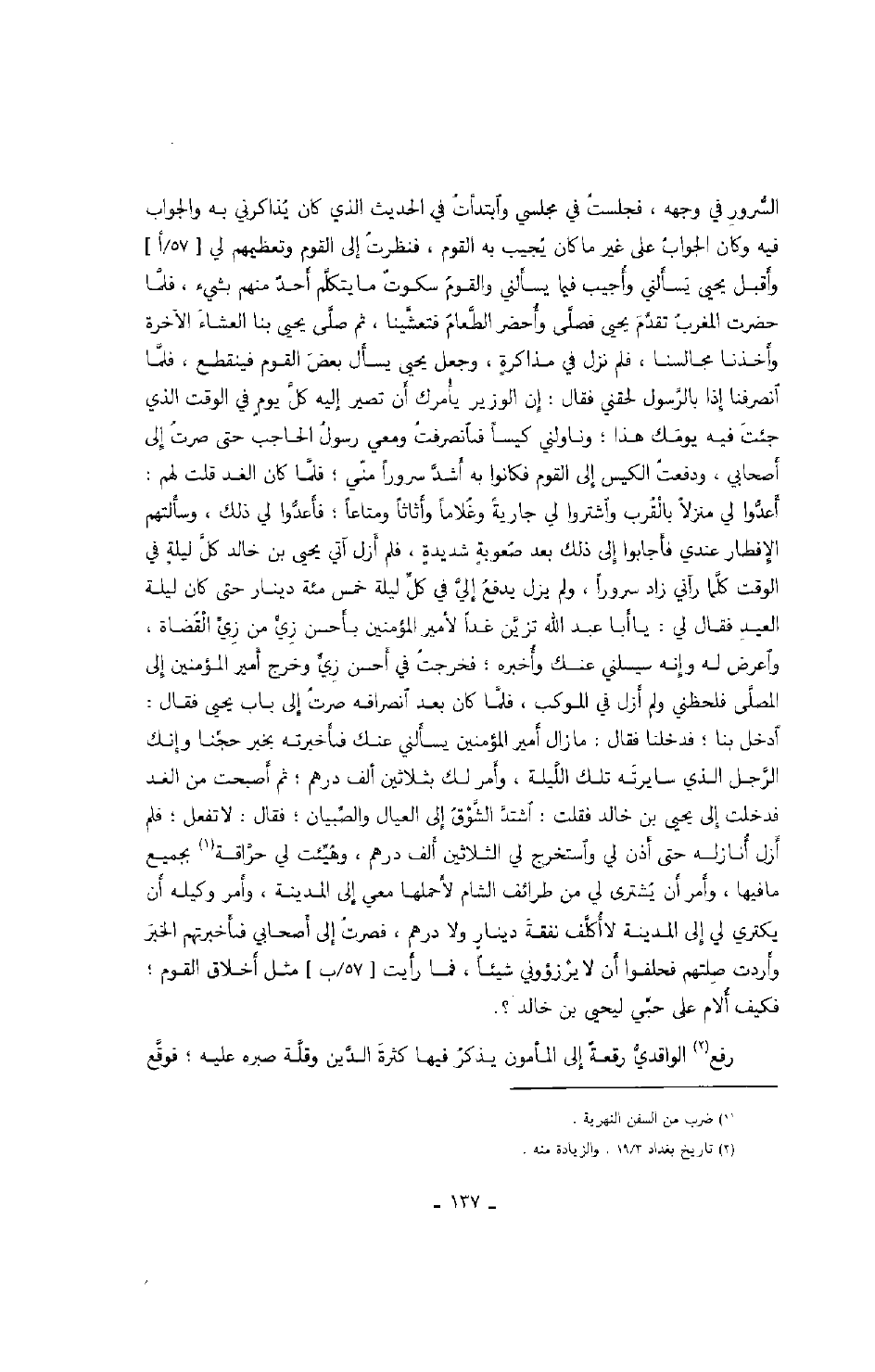السرور في وجهه، فجلست في مجلسي وابتدأت في الحديث الذي كان يذاكرني به والجواب فيه وكان الجواب على غير ما كان يجيب به القوم، فنظرت إلى القوم وتعظيمهم لي وأقبل يحيى يسألني وأجيب فيما يسألني والقوم سكوتٌ وأحضر الطعام فتعشينا، ثم صلى يحيى بنا العشاء الآخرة وأخذنا مجالسنا، فلم نزل في مذاكرةٍ، وجعل يحيى يسأل بعض القوم فينقطع، فلما انصرفنا إذا بالرسول لحقني فقال: إن الوزير يأمرك أن تصير إليه كل يومٍ في الوقت الذي جئت فيه يومك هذا؛ وناولني كيساً فانصرفت ومعي رسول الحاجب حتى صرت إلى أصحابي، ودفعت الكيس إلى القوم فكانوا به أشد سروراً مني؛ فلما كان الغد قلت لهم: أعدوا لي منزلاً بالقرب واشتروا لي جاريةً وغلاماً وأثاثاً ومتاعاً؛ فأعدوا لي ذلك، وسألتهم الإفطار عندي فأجابوا إلى ذلك بعد صعوبةٍ شديدةٍ، فلم أزل آتي يحيى بن خالد كل ليلةٍ في الوقت كلما رآني زاد سروراً، ولم يزل يدفع إلي في كل ليلة خمس مئة دينار حتى كان ليلة العيد فقال لي: يا أبا عبد الله تزين غداً لأمير المؤمنين بأحسن زي من زي القضاة، واعرض له وإنه سيسلني عنك وأخبره؛ فخرجت في أحسن زي وخرج أمير المؤمنين إلى المصلى فلحظني ولم أزل في الموكب، فلما كان بعد انصرافه صرت إلى باب يحيى فقال: ادخل بنا؛ فدخلنا فقال: ما زال أمير المؤمنين يسألني عنك فأخبرته بخبر حجنا وإنك الرجل الذي سايرته تلك الليلة، وأمر لك بثلاثين ألف درهم؛ ثم أصبحت من الغد فدخلت إلى يحيى بن خالد فقلت: اشتد الشوق إلى العيال والصبيان؛ فقال: لا تفعل؛ فلم أزل أنازله حتى أذن لي واستخرج لي الثلاثين ألف درهم، وهيئت لي حراقة بجميع ما فيها، وأمر أن يشتري لي من طرائف الشام لأحملها معي إلى المدينة، وأمر وكيله أن يكتري لي إلى المدينة لا أكلف نفقة دينارٍ ولا درهم، فصرت إلى أصحابي فأخبرتهم الخبر وأردت صلتهم فحلفوا أن لا يرزؤوني شيئاً، فما رأيت مثل أخلاق القوم؛ فكيف ألام على حبي ليحيى بن خالد؟.الناس، وحملت باقي الكيس إلى الزبيري، فلما رآني سر سروراً شديداً ثم أخبرته الخبر فقال: إني سأحضر إلى المدينة، فقلت: إني خلفت العيال على ما علمت، فدفعت إليه مئتي دينارٍ يوصلها إلى العيال، ثم صليت العصر وتهيأت بأحسن هيئةٍ، ثم صرت إلى باب يحيى بن خالد فأذن لي، فدخلت فلما رآني في تلك الحال نظرت إلى السرور في وجهه، فجلست في مجلسي وابتدأت في الحديث الذي كان يذاكرني به والجواب فيه وكان الجواب على غير ما كان يجيب به القوم، فنظرت إلى القوم وتعظيمهم لي وأقبل يحيى يسألني وأجيب فيما يسألني والقوم سكوتٌ وأحضر الطعام فتعشينا، ثم صلى يحيى بنا العشاء الآخرة وأخذنا مجالسنا، فلم نزل في مذاكرةٍ، وجعل يحيى يسأل بعض القوم فينقطع، فلما انصرفنا إذا بالرسول لحقني فقال: إن الوزير يأمرك أن تصير إليه كل يومٍ في الوقت الذي جئت فيه يومك هذا؛ وناولني كيساً فانصرفت ومعي رسول الحاجب حتى صرت إلى أصحابي، ودفعت الكيس إلى القوم فكانوا به أشد سروراً مني؛ فلما كان الغد قلت لهم: أعدوا لي منزلاً بالقرب واشتروا لي جاريةً وغلاماً وأثاثاً ومتاعاً؛ فأعدوا لي ذلك، وسألتهم الإفطار عندي فأجابوا إلى ذلك بعد صعوبةٍ شديدةٍ، فلم أزل آتي يحيى بن خالد كل ليلةٍ في الوقت كلما رآني زاد سروراً، ولم يزل يدفع إلي في كل ليلة خمس مئة دينار حتى كان ليلة العيد فقال لي: يا أبا عبد الله تزين غداً لأمير المؤمنين بأحسن زي من زي القضاة، واعرض له وإنه سيسلني عنك وأخبره؛ فخرجت في أحسن زي وخرج أمير المؤمنين إلى المصلى فلحظني ولم أزل في الموكب، فلما كان بعد انصرافه صرت إلى باب يحيى فقال: ادخل بنا؛ فدخلنا فقال: ما زال أمير المؤمنين يسألني عنك فأخبرته بخبر حجنا وإنك الرجل الذي سايرته تلك الليلة، وأمر لك بثلاثين ألف درهم؛ ثم أصبحت من الغد فدخلت إلى يحيى بن خالد فقلت: اشتد الشوق إلى العيال والصبيان؛ فقال: لا تفعل؛ فلم أزل أنازله حتى أذن لي واستخرج لي الثلاثين ألف درهم، وهيئت لي حراقة بجميع ما فيها، وأمر أن يشتري لي من طرائف الشام لأحملها معي إلى المدينة، وأمر و