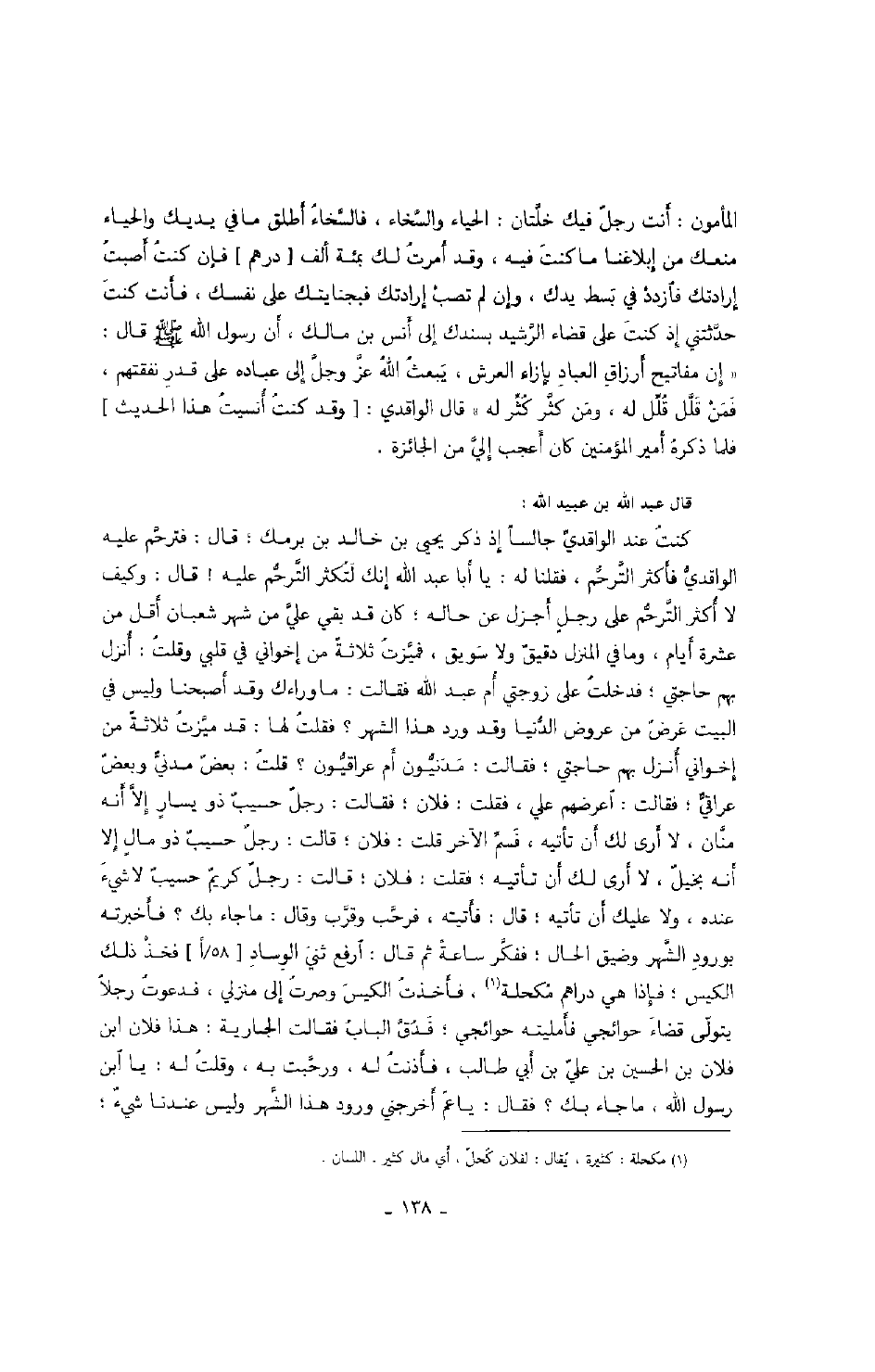 قال عبد الله بن عبيد الله: كنت عند الواقدي جالساً إذ ذكر يحيى بن خالد بن برمك؛ قال: فترحم عليه الواقدي فأكثر الترحم، فقلنا له: يا أبا عبد الله إنك لتكثر الترحم عليه قال: وكيف لا أكثر الترحم على رجلٍ أجزل عن حاله؛ كان قد بقي علي من شهر شعبان أقل من عشرة أيام، وما في المنزل دقيقٌ ولا سويق، فميزت ثلاثةً من إخواني في قلبي وقلت: أنزل بهم حاجتي؛ فدخلت على زوجتي أم عبد الله فقالت: ما وراءك وقد أصبحنا وليس في البيت عرضٌ من عروض الدنيا وقد ورد هذا الشهر؟ فقلت لها: قد ميزت ثلاثةً من إخواني أنزل بهم حاجتي؛ فقالت: مدنيون أم عراقيون؟ قلت: بعضٌ مدني ويعض عراقي؛ فقالت: اعرضهم علي، فقلت: فلان؛ فقالت: رجلٌ حسيبٌ ذو يسارٍ إلا أنه منان، لا أرى لك أن تأتيه، فسم الآخر قلت: فلان؛ قالت: رجلٌ حسيبٌ ذو مالٍ إلا أنه بخيلٌ، لا أرى لك أن تأتيه؛ فقلت: فلان؛ قالت: رجل كريمٌ حسيبٌ لا شيء عنده، ولا عليك أن تأتيه؛ قال: فأتيته، فرحب وقرب وقال: ما جاء بك؟ فأخبرته بورود الشهر وضيق الحال؛ ففكر ساعةً ثم قال: ارفع ثني الوساد فخذ ذلك الكيس؛ فإذا هي دراهم مكحلة، فأخذت الكيس وصرت إلى منزلي، فدعوت رجلاً يتولى قضاء حوائجي فأمليته حوائجي؛ فدق الباب فقالت الجارية: هذا فلان ابن فلان بن الحسين بن علي بن أبي طالب، فأذنت له، وحبت به، وقلت له: يا ابن رسول الله، ما جاء بك؟ فقال: يا عم أخرجني ورود هذا الشهر وليس عندنا شيءٌ؛