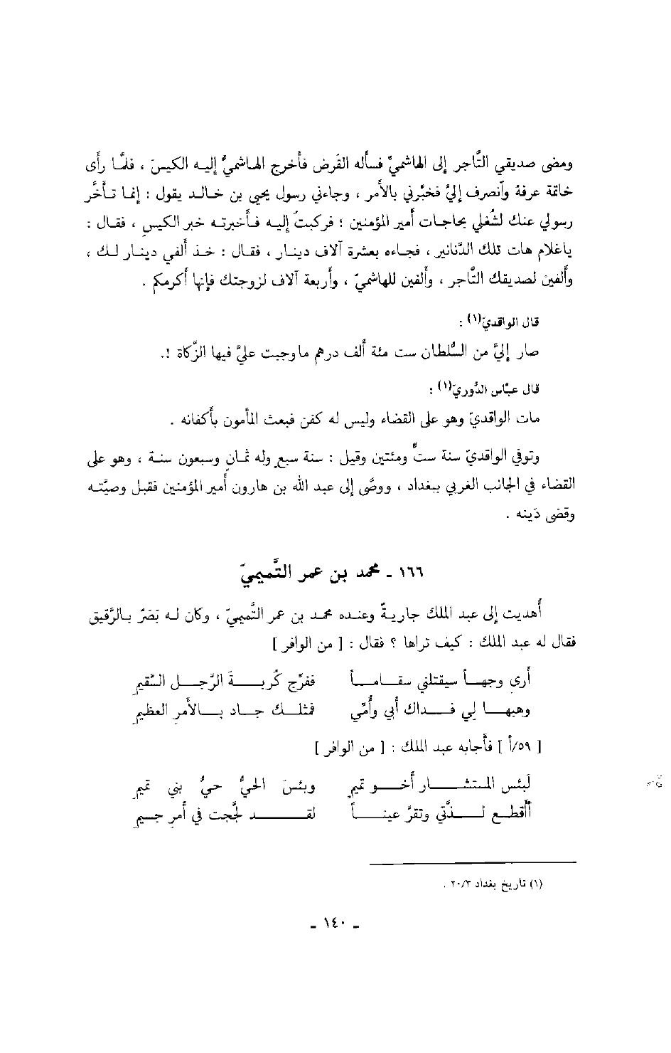أهديت إلى عبد الملك جاريةٌ وعنده محمد بن عمر التميمي، وكان له بصرٌ بالرقيق فقال له عبد الملك: كيف تراها؟ فقال: من الوافر