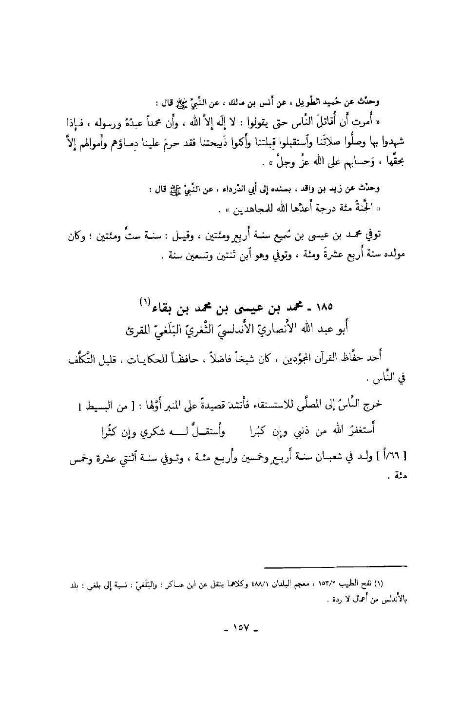 ابن بقاء أبو عبد الله الأنصاري الأندلسي الثغري البلغي المقرئ أحد حفاظ القرآن المجودين، كان شيخاً فاضلاً، حافظاً للحكايات، قليل التكلف في الناس.