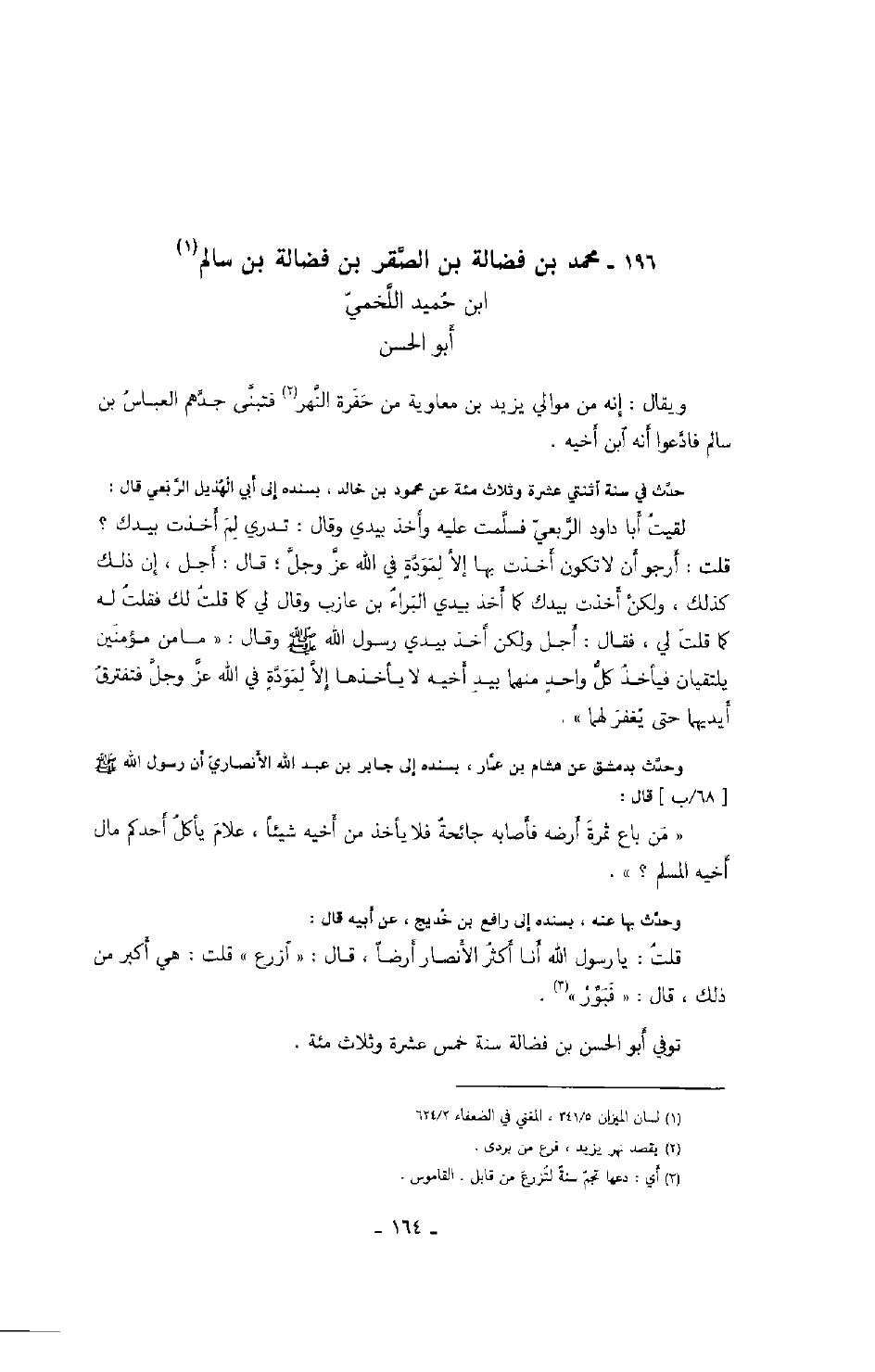وحدث بدمشق عن هشام بن عمار، بسنده إلى جابر بن عبد الله الأنصاري أن رسول الله صَلَّى اللهُ عَلَيْهِ وَسَلَّمَ قال: " من باع ثمرة أرضه فأصابه جائحةٌ فلا يأخذ من أخيه شيئاً، علام يأكل أحدكم مال أخيه المسلم؟ ".