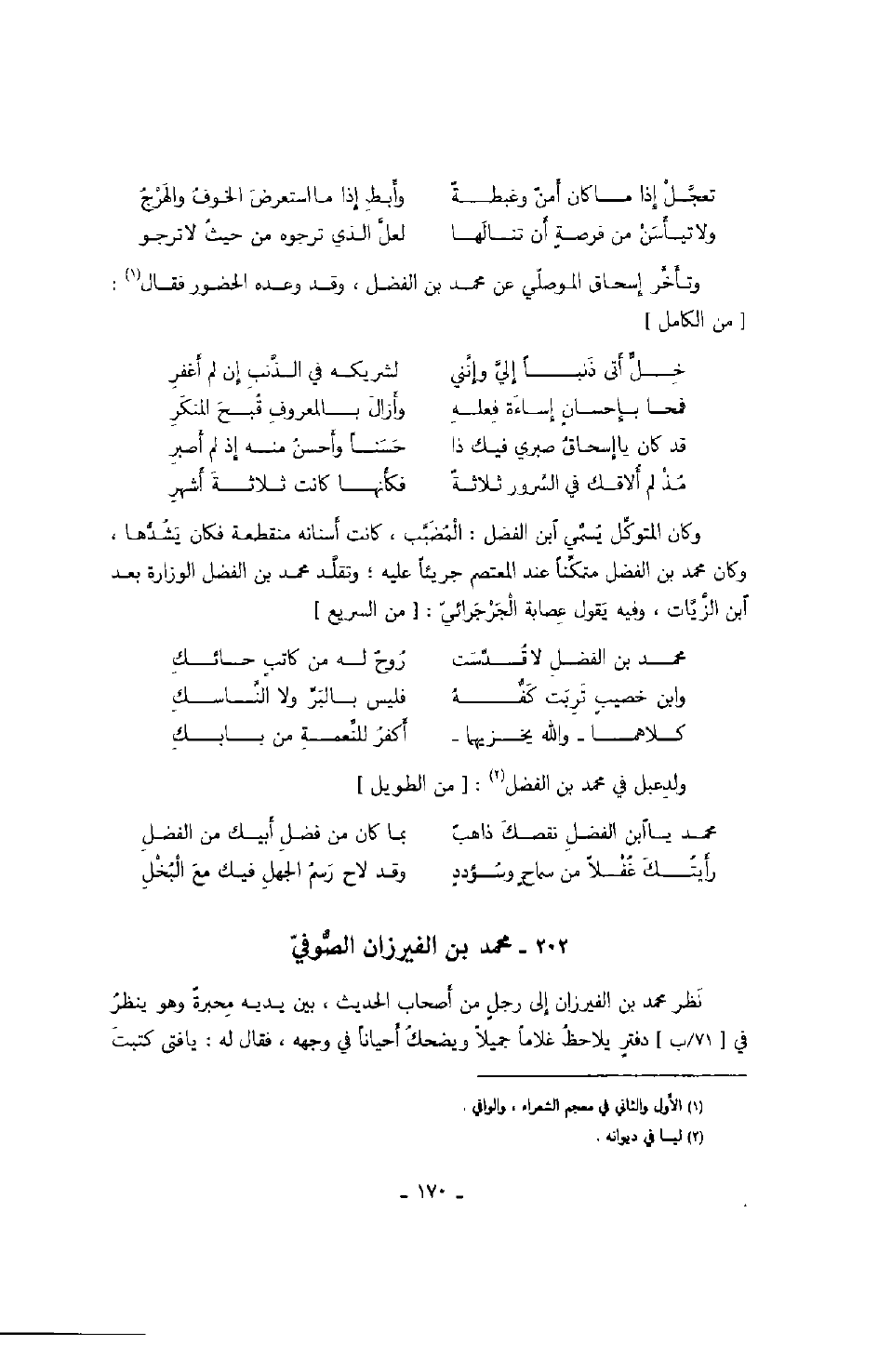 وتأخر إسحاق الموصلي عن محمد بن الفصل، وقد وعده الحضور فقال: من الكامل