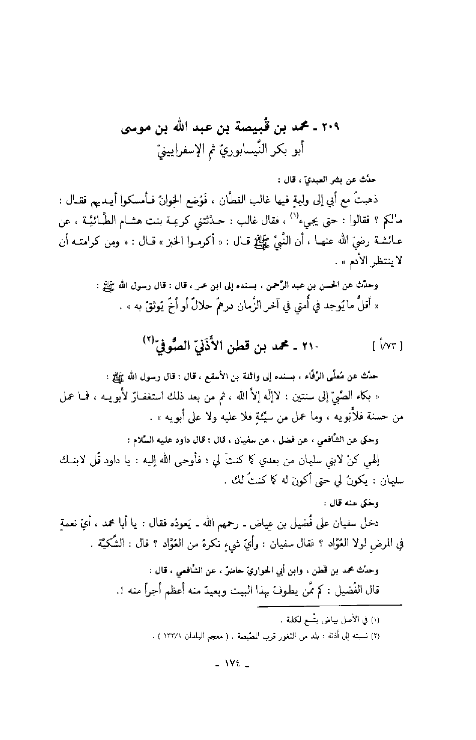 ابن موسى أبو بكر النيسابوري ثم الإسفراييني حدث عن بشر العبدي، قال: ذهبت مع أبي إلى وليمةٍ فيها غالب القطان، فوضع الخوان فأمسكوا أيديهم فقال: ما لكم؟ فقالوا: حتى يجيء، فقال غالب: حدثتني كريمة بنت هشام الطائية، عن عائشة رضي الله عنها، أن النبي صَلَّى اللهُ عَلَيْهِ وَسَلَّمَ قال: " أكرموا الخبز " قال: " ومن كرامته أن لا ينتظر الأدم ".
