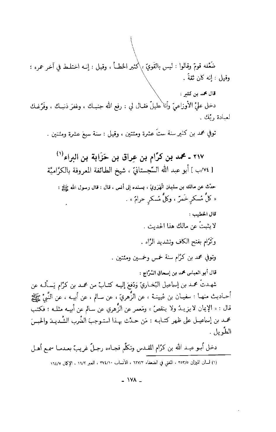 ابن البراء أبو عبد الله السجستاني، شيخ الطائفة المعروفة بالكرامية حدث عن مالك بن سليمان الهروي، بسنده إلى أنس قال: قال رسول الله صَلَّى اللهُ عَلَيْهِ وَسَلَّمَ: " كل مسكرٍ خمرٌ، وكل مسكرٍ حرامٌ ".