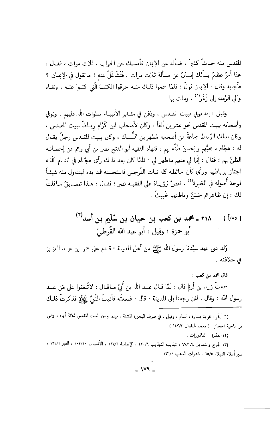 المقدس منه حديثاً كثيراً، فسأله عن الإيمان فأمسك عن الجواب، ثلاث مرات، فقال: هذا أمرٌ عظيمٌ يسألك إنسانٌ عن مسألة ثلاث مرات، فتشاغل عنه ما تقول في الإيمان؟ فأجابه وقال: الإيمان قولٌ؛ فلما سمعوا ذلك منه حرقوا الكتب التي كتبوا عنه، ونفاه والي الرملة إلى زغر، ومات بها.