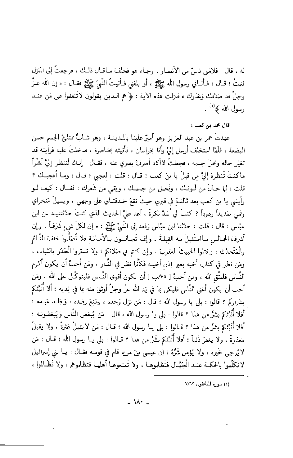عهدت عمر بن عبد العزيز وهو أميرٌ علينا بالمدينة، وهو شاب ممتلئ الجسم حسن البضعة، فلما استخلف أرسل إلي وأنا بخراسان، فأتيته بخناصرة، فدخلت عليه فرأيته قد تغير حاله ونحل جسمه، فجعلت لا أكاد أصرف بصري عنه، فقال: إنك لتنظر إلي نظراً ما كنت تنظره إلي من قبل يا بن كعب قال: قلت: لعجبي؛ قال: وما أعجبك؟ قلت: لما حال من لونك، ونحل من جسمك، وبقي من شعرك؛ فقال: كيف لو رأيتني يا بن كعب بعد ثالثةٍ في قبري حيث تقع حدقتاي على وجهي، ويسيل منخراي وفمي صديداً ودوداً؟ كنت لي أشد نكرةً، أعد علي الحديث الذي كنت حدثتنيه عن ابن عباس؛ قال: قلت: حدثنا ابن عباس رفعه إلى النبي صَلَّى اللهُ عَلَيْهِ وَسَلَّمَ: " إن لكل شيءٍ شرفاً، وإن أشرف المجالس ما استقبل به القبلة، وإنما تجالسون بالأمانة فلا تصلوا خلف النائم والمتحدث، واقتلوا الخبيث العقرب، وإن كنتم في صلاتكم؛ ولا تستروا الجدر بالثياب، ومن نظر في كتاب أخيه بغير إذن أخيه فكأنما نظر في النار، ومن أحب أن يكون أكرم الناس فليتق الله، ومن أحب أن يكون أقوى الناس فليتوكل على الله، ومن أحب أن يكون أغنى الناس فليكن بما في يد الله عز وجل أوثق منه بما في يديه؛ ألا أنبئكم بشراركم؟ قالوا: بلى يا رسول الله؛ قال: من نزل وحده، ومنع رفده، وجلد عبده؛ أفلا أنبئكم بشر من هذا؟ قالوا: بلى يا رسول الله، قال: من يبغض الناس ويبغضونه؛ أفلا أنبئكم بشر من هذا؟ قالوا: بلى يا رسول الله؛ قال: من لا يقيل عثرةً، ولا يقبل معذرةً، ولا يغفر ذنباً؛ أفلا أنبئكم بشر من هذا؟ قالوا: بلى يا رسول الله؛ قال: من لا يرجى خيره، ولا يؤمن شره؛ إن عيسى بن مريم قام في قومه فقال: يا بني إسرائيل لا تكلموا بالحكمة عند الجهال فتظلموها، ولا تمنعوها أهلها فتظلموهم، ولا تظالموا،