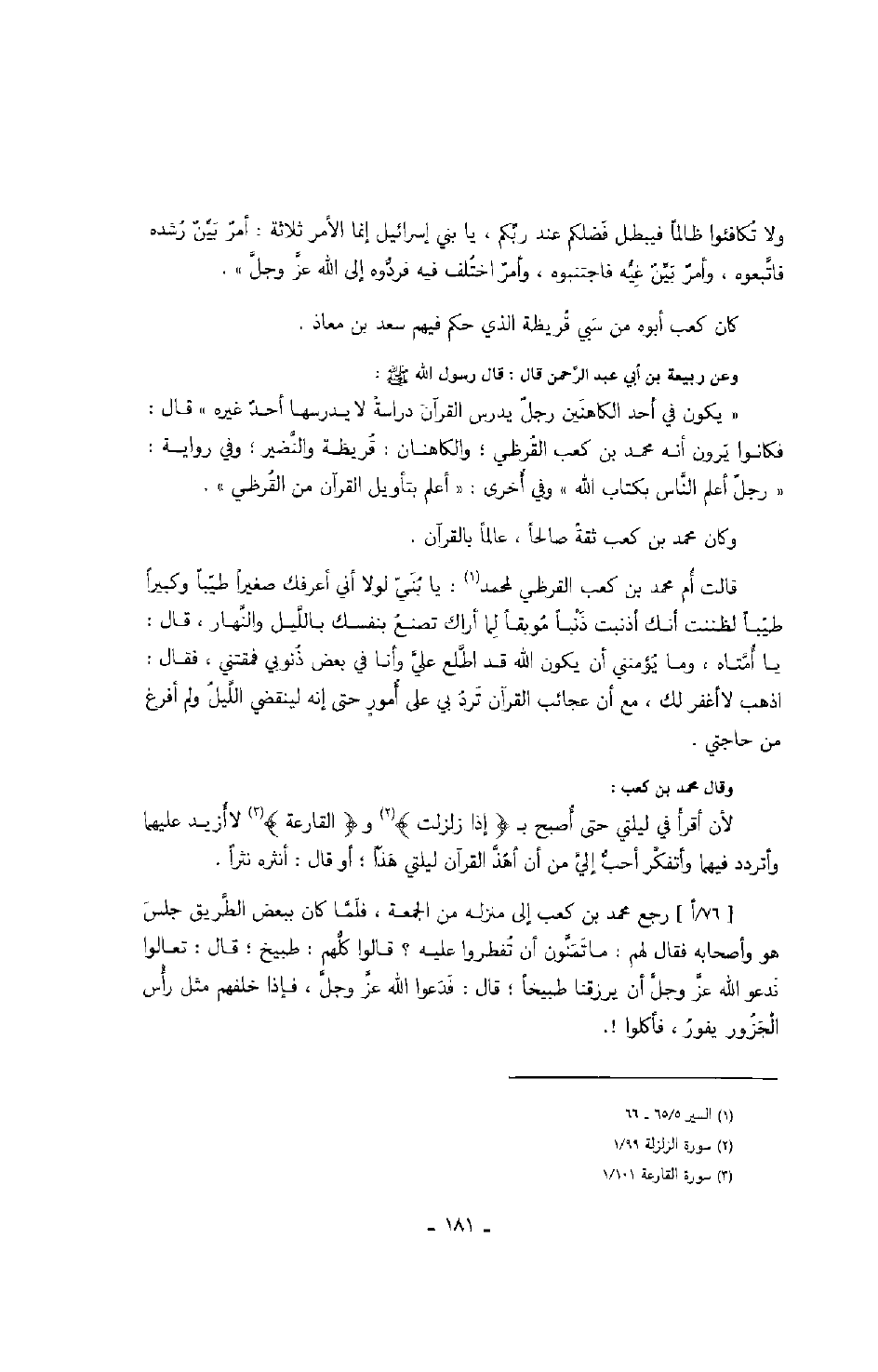 وعن ربيعة بن أبي عبد الرحمن قال: قال رسول الله صَلَّى اللهُ عَلَيْهِ وَسَلَّمَ: " يكون في أحد الكاهنين رجلٌ يدرس القرآن دراسةً لا يدرسها أحدٌ غيره " قال: فكانوا يرون أنه محمد بن كعب القرظي؛ والكاهنان: قريظة والنضير؛ وفي رواية: " رجلٌ أعلم الناس بكتاب الله " وفي أخرى: " أعلم بتأويل القرآن من القرظي ".