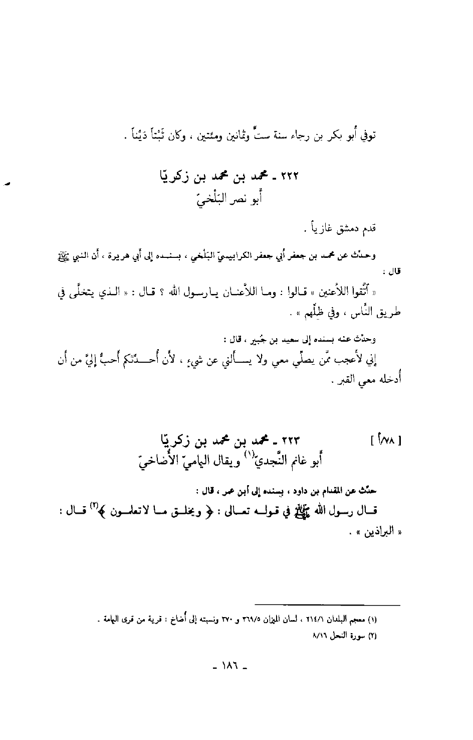 النجدي ويقال اليمامي الأضاخي حدث عن المقدام بن داود، بسنده إلى ابن عمر، قال: قال رسول الله صَلَّى اللهُ عَلَيْهِ وَسَلَّمَ في قوله تعالى: " ويخلق ما لا تعلمون قال: " البراذين ".