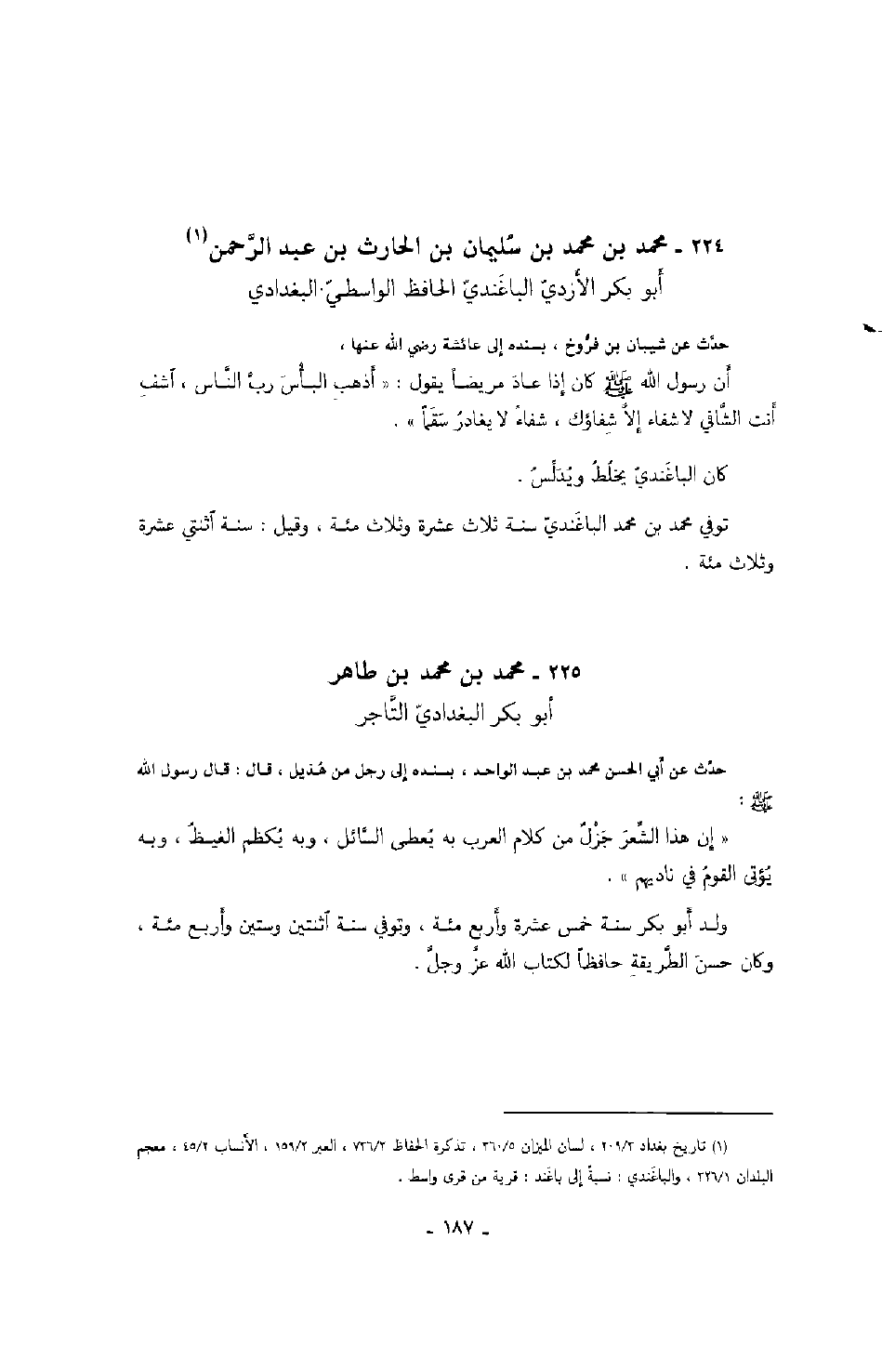 ابن عبد الرحمن أبو بكر الأزدي الباغندي الحافظ الواسطي البغدادي حدث عن شيبان بن فروخ، بسنده إلى عائشة رضي الله عنها، أن رسول الله صَلَّى اللهُ عَلَيْهِ وَسَلَّمَ كان إذا عاد مريضاً يقول: " أذهب البأس رب الناس، اشف أنت الشافي لا شفاء إلا شفاؤك، شفاءً لا يغادر سقماً ".