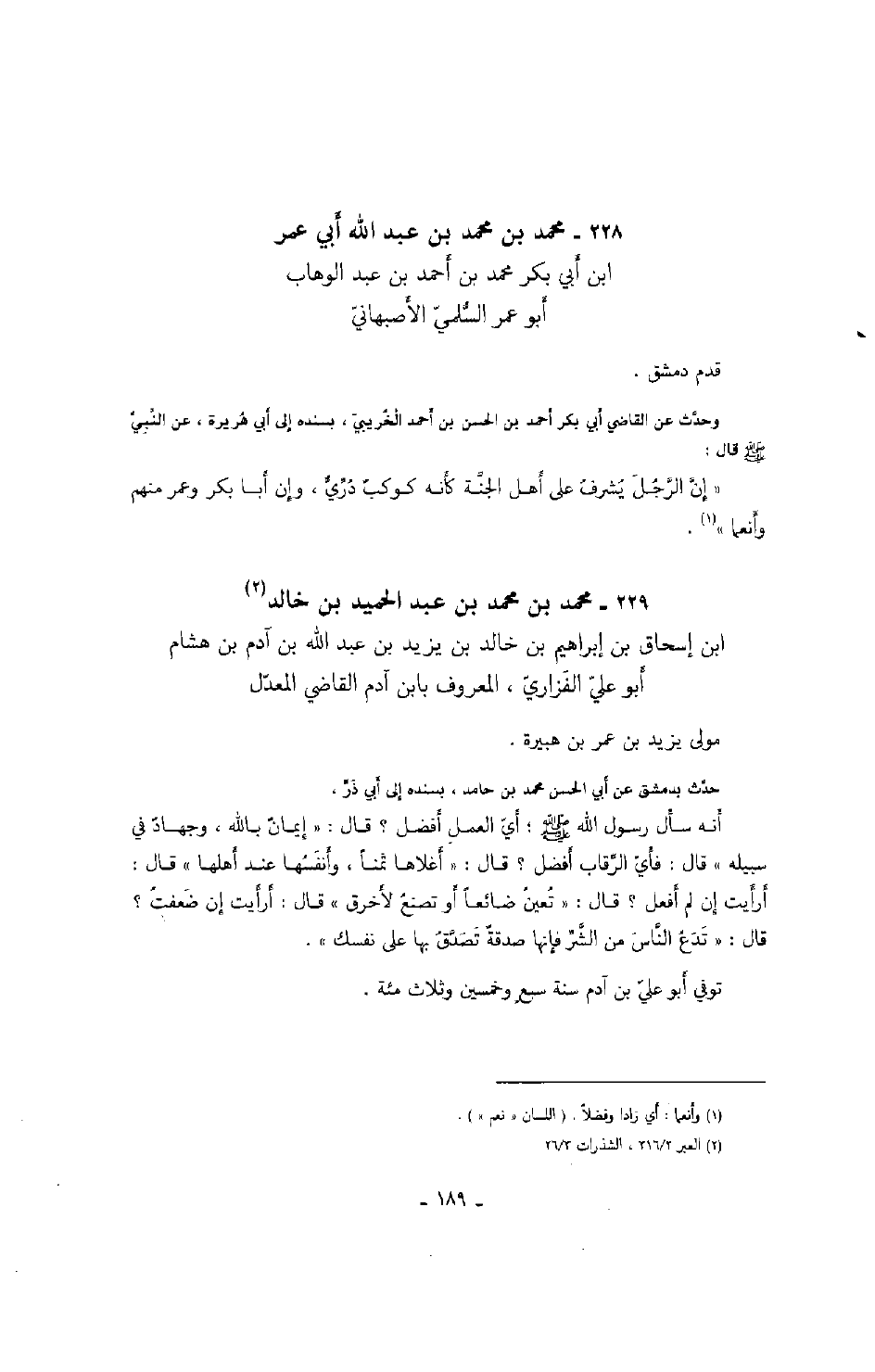 حدث بدمشق عن أبي الحسن محمد بن حامد، بسنده إلى أبي ذر، أنه سأل رسول الله صَلَّى اللهُ عَلَيْهِ وَسَلَّمَ؛ أي الأعمال أفضل؟ قال: " إيمانٌ بالله، وجهادٌ في سبيله " قال: فأي الرقاب أفضل؟ قال: " أغلاها ثمناً، وأنفسها عند أهلها " قال: أرأيت إن لم أفعل؟ قال: " تعين ضائعاً أو تصنع لأخرق " قال: أرأيت إن ضعفت؟ قال: " تدع الناس من الشر فإنها صدقةٌ تصدق بها على نفسك ".