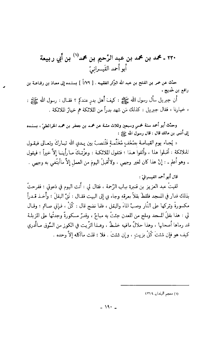 ابن محمد بن أبي ربيعة أبو أحمد القيسراني حدث عن عمر بن الفتح بن عبد الله البزار الفقيه. بسنده إلى معاذ بن رفاعة بن رافع بن خديج، أن جبريل سأل رسول الله صَلَّى اللهُ عَلَيْهِ وَسَلَّمَ: كيف أهل بدرٍ عندكم؟ فقال: رسول الله صَلَّى اللهُ عَلَيْهِ وَسَلَّمَ: " خيارنا " فقال جبريل: كذلك من شهد بدراً من الملائكة هم خيار الملائكة.