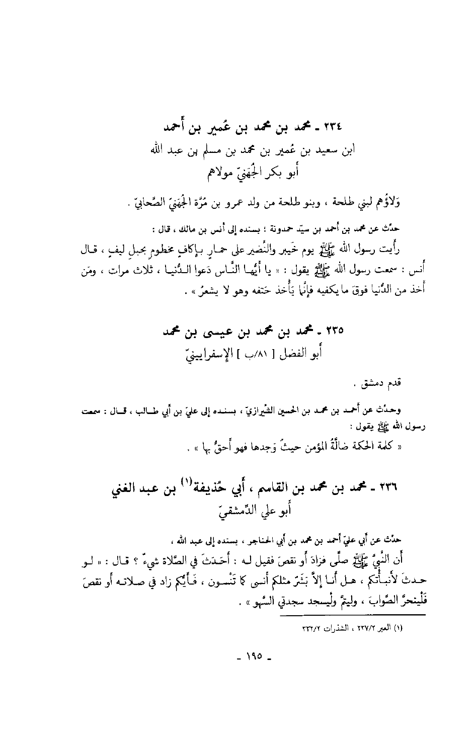 أبي حذيفة بن عبد الغني أبو علي الدمشقي حدث عن أبي علي أحمد بن محمد بن أبي الحناجر، بسنده إلى عبد الله، أن النبي صَلَّى اللهُ عَلَيْهِ وَسَلَّمَ صلى فزاد أو نقص فقيل له: أحدث في الصلاة شيءٌ؟ قال: " لو حدث لأنبأتكم، هل أنا إلا بشرٌ مثلكم أنسى كما تنسون، فأيكم زاد في صلاته أو نقص فليتحر الصواب، وليتم وليسجد سجدتي السهو ".