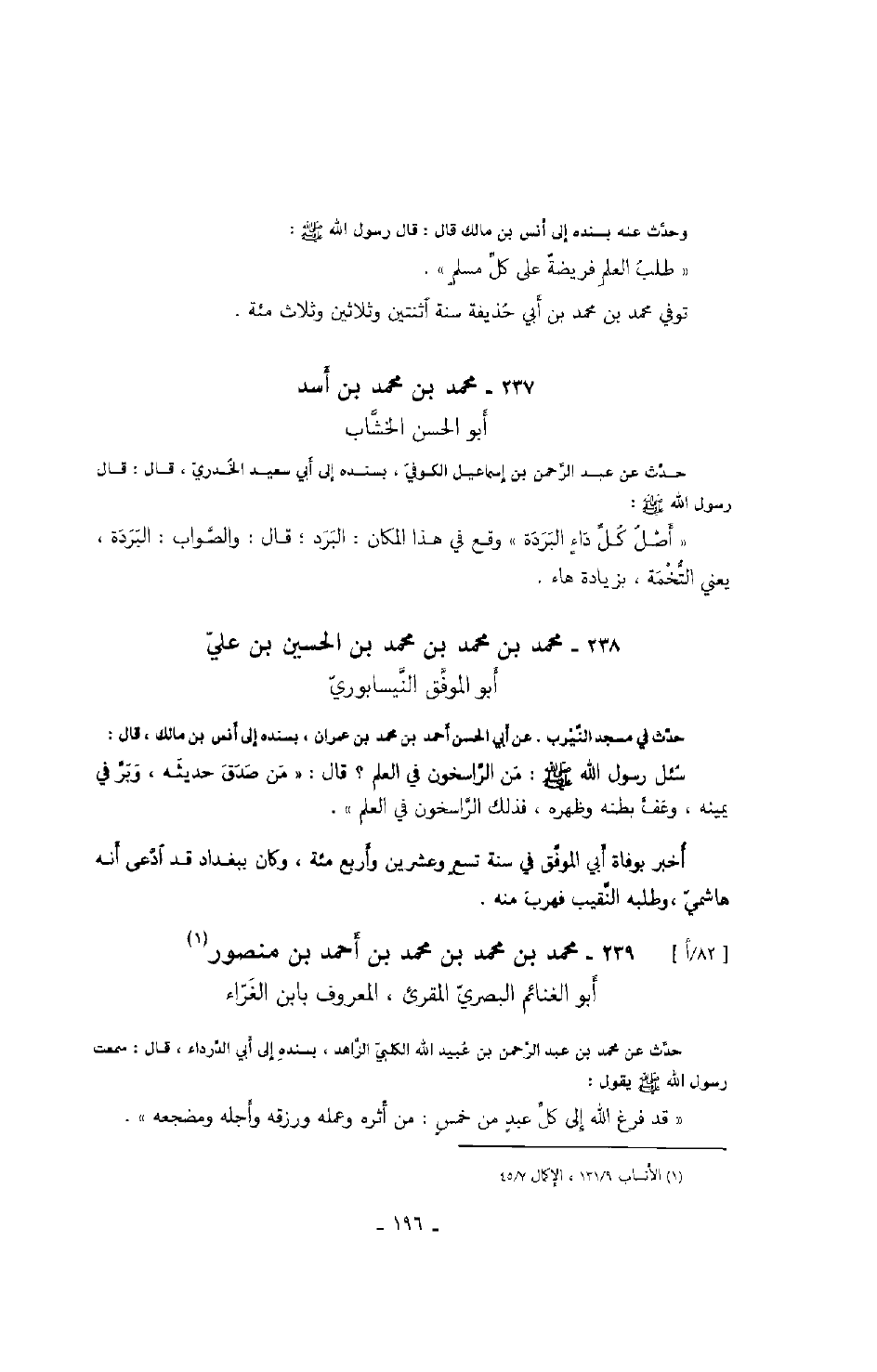 ابن علي أبو الموفق النيسابوري حدث في مسجد النيرب. عن أبي الحسن أحمد بن محمد بن عمران، بسنده إلى أنس بن مالك، قال: سئل رسول الله صَلَّى اللهُ عَلَيْهِ وَسَلَّمَ: من الراسخون في العلم؟ قال: " من صدق حديثه، وبر في يمينه، وعف بطنه وظهره، فذلك الراسخون في العلم ".