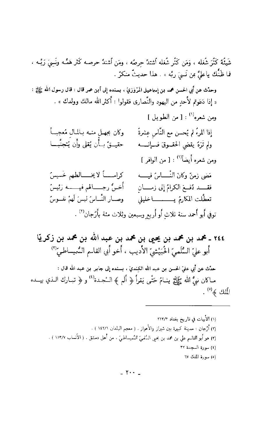 ابن عبد الله بن محمد بن زكريا أبو علي السلمي الحبيشي الأديب، أخو أبي القاسم السميساطي حدث عن أبي علي الحسن بن عبد الله الكندي، بسنده إلى جابر بن عبد الله قال: ما كان نبي الله صَلَّى اللهُ عَلَيْهِ وَسَلَّمَ ينام حتى يقرأ " ألم " السجدة و" تبارك الذي بيده الملك ".