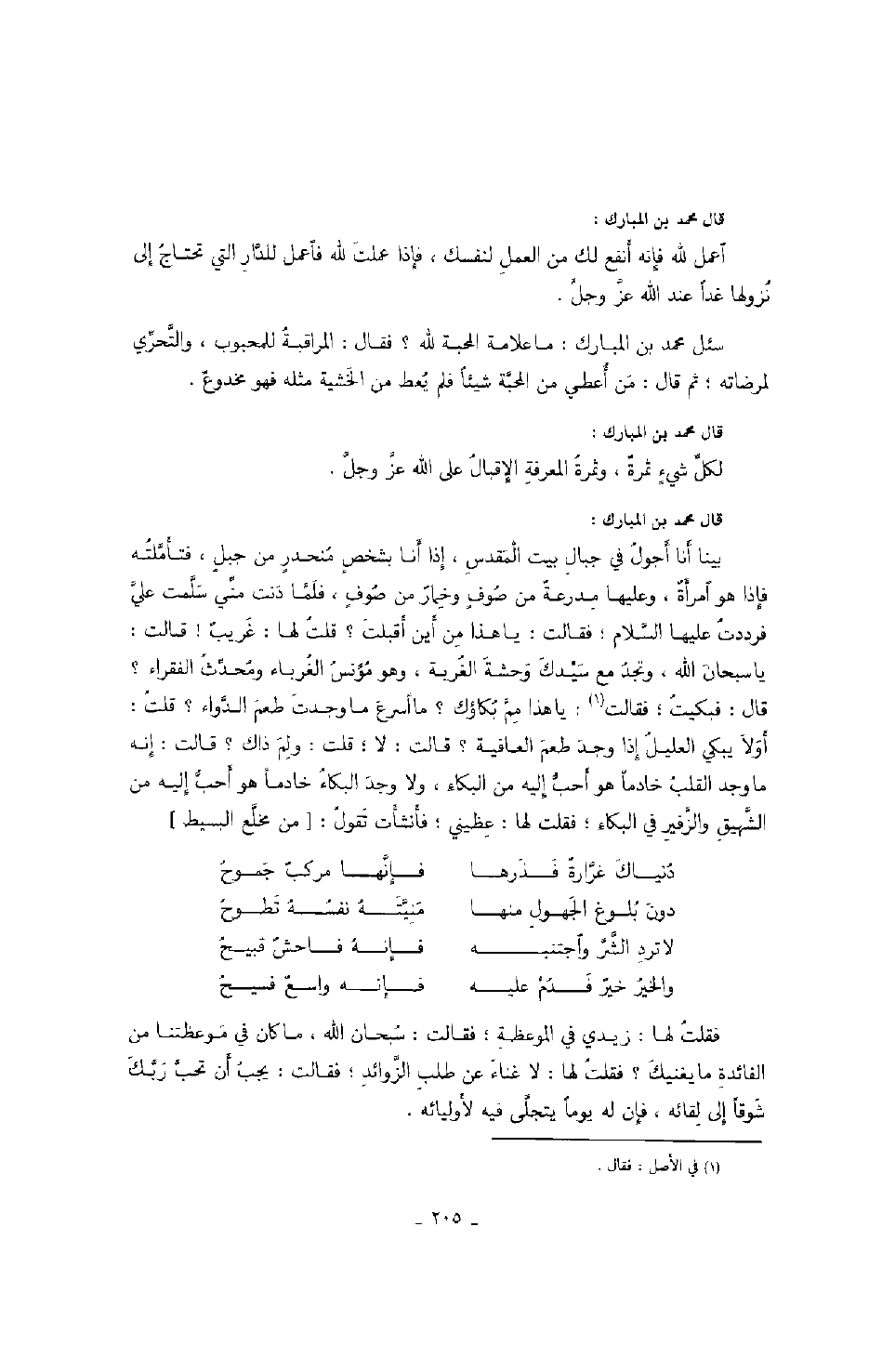 بينا أنا أجول في جبال بيت المقدس، إذا أنا بشخصٍ منحدرٍ من جبلٍ، فتأملته فإذا هو امرأةٌ، وعليها مدرعةٌ من صوف وخمارٌ من صوفٍ، فلما دنت مني سلمت علي فرددت عليها السلام؛ فقالت: يا هذا من أين أقبلت؟ قلت لها: غريبٌ قالت: يا سبحان الله، وتجد مع سيدك وحشة الغربة، وهو مؤنس الغرباء ومحث الفقراء؟ قال: فبكيت؛ فقالت: يا هذا مم بكاؤك؟ ما أسرع ما وجدت طعم الدواء؟ قلت: أولا يبكي العليل إذا وجد طعم العافية؟ قالت: لا؛ قلت: ولم ذاك؟ قالت: إنه ما وجد القلب خادماً هو أحب إليه من البكاء، ولا وجد البكاء خادماً هو أحب إليه من الشهيق والزفير في البكاء؛ فقلت لها: عظيني؛ فأنشأت تقول: من مخلع البسيط