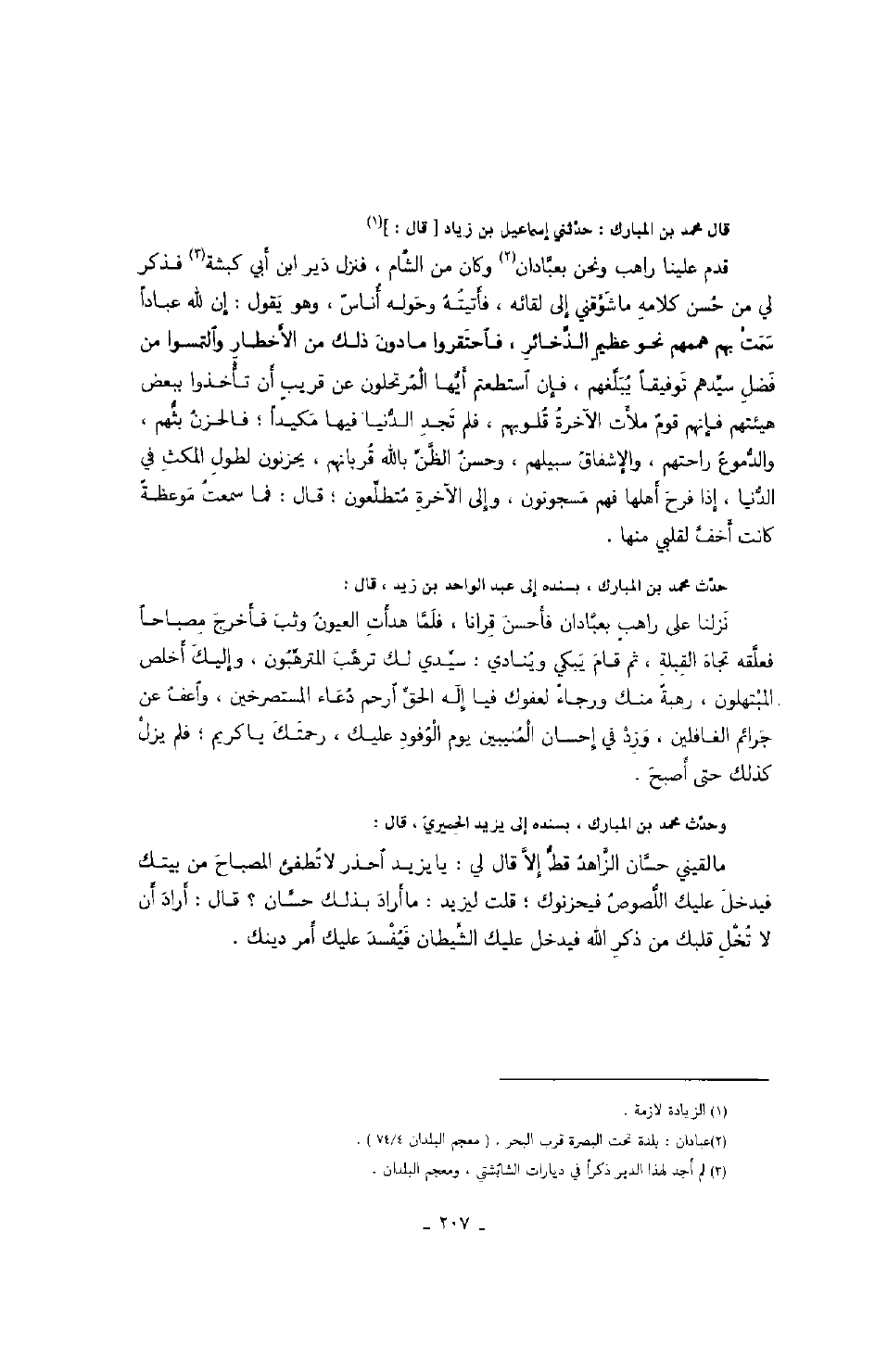 قال محمد بن المبارك: حدثني إسماعيل بن زياد قال: قدم علينا راهب ونحن بعبادان وكان من الشام، فنزل دير ابن أبي كبشة فذكر لي من حسن كلامه ما شوقني إلى لقائه، فأتيته وحوله أناسٌ، وهو يقول: إن لله عباداً سمت بهم هممهم نحو عظيم الذخائر، فاحتقروا ما دون ذلك من الأخطار والتمسوا من فضل سيدهم توفيقاً يبلغهم، فإن استطعتم أيها المرتحلون عن قريبٍ أن تأخذوا ببعض هيئتهم فإنهم قومٌ ملأت الآخرة قلوبهم، فلم تجد الدنيا فيها مكيداً؛ فالحزن بثهم، والدموع راحتهم، والإشفاق سبيلهم، وحسن الظن بالله قربانهم، يحزنون لطول المكث في الدنيا، إذا فرح أهلها فهم مسجونون، وإلى الآخرة متطلعون؛ قال: فما سمعت موعظةً كانت أخف لقلبي منها.
