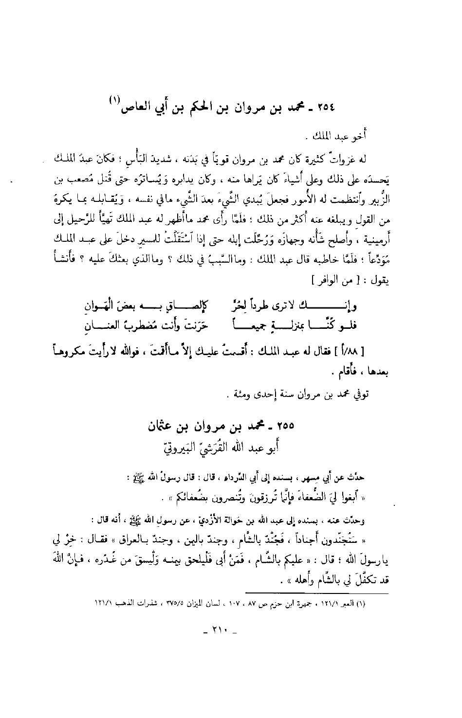 له غزواتٌ كثيرة كان محمد بن مروان قوياً في بدنه، شديد البأس؛ فكان عبد الملك يحسده على ذلك وعلى أشياء كان يراها منه، وكان يدابره ويساتره حتى قتل مصعب بن الزبير وانتظمت له الأمور فجعل يبدي الشيء بعد الشيء ما في نفسه، ويقابله بما يكره من القول ويبلغه عنه أكثر من ذلك؛ فلما رأى محمد ما أظهر له عبد الملك تهيأ للرحيل إلى أرمينية، وأصلح شأنه وجهازه ورحلت إبله حتى إذا استقلت للمسير دخل على عبد الملك مودعاً؛ فلما خاطبه قال عبد الملك: وما السبب في ذلك؟ وما الذي بعثك عليه؟ فأنشأ يقول: من الوافر