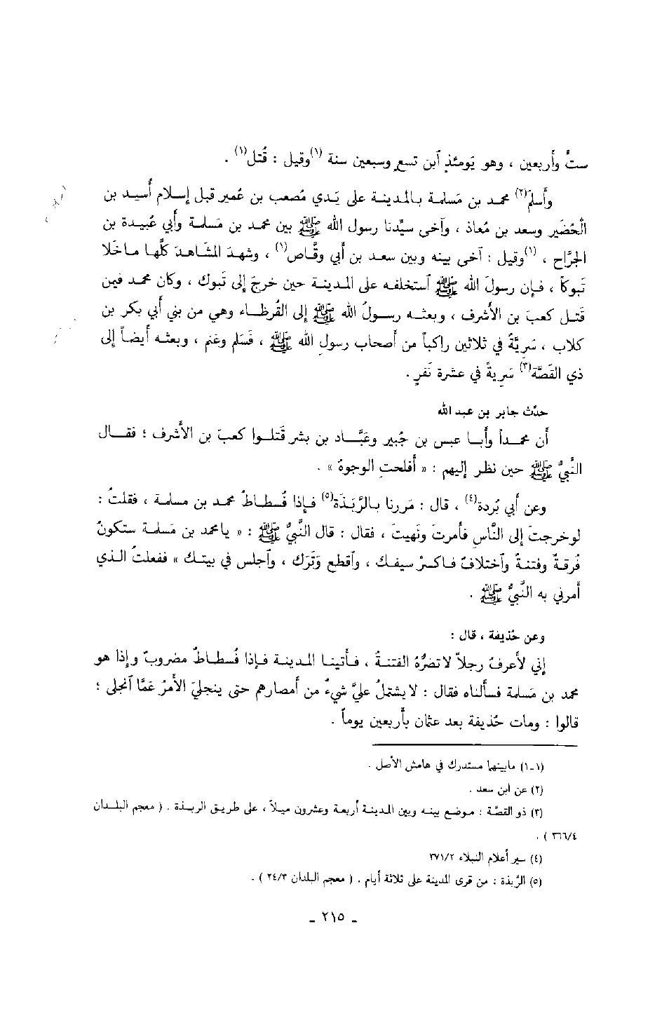 وعن حذيفة، قال: إني لأعرف رجلاً لا تضره الفتنة، فأتينا المدينة فإذا فسطاط مضروبٌ وإذا هو محمد بن مسلمة فسألناه فقال: لا يشتمل علي شيءٌ من أمصارهم حتى ينجلي الأمر عما انجلى؛ قالوا: ومات حذيفة بعد عثمان بأربعين يوماً.