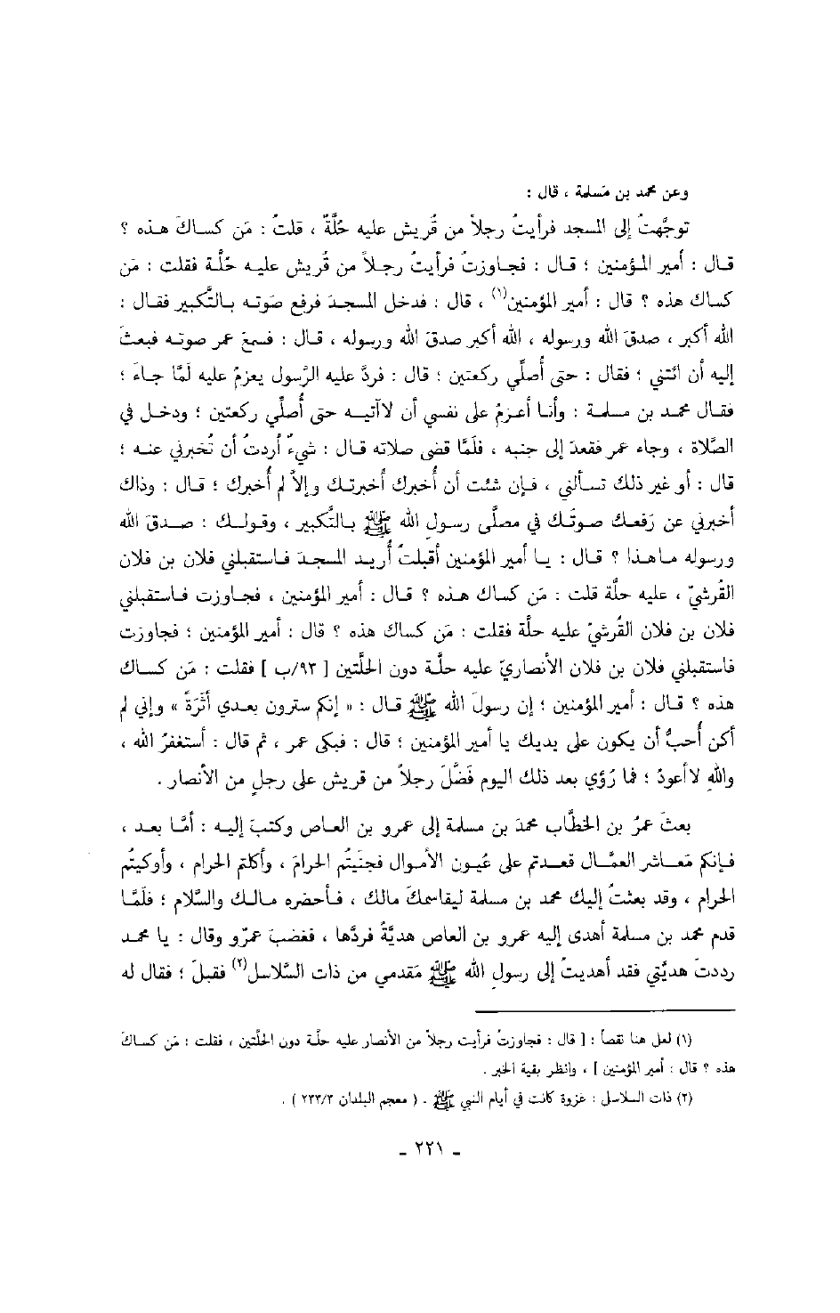 توجهت إلى المسجد فرأيت رجلاً من قريش عليه حلةٌ، قلت: من كساك هذه؟ قال: أمير المؤمنين؛ قال: فجاوزت فرأيت رجلاً من قريش عليه حلة فقلت: من كساك هذه؟ قال: أمير المؤمنين، قال: فدخل المسجد فرفع صوته بالتكبير فقال: الله أكبر، صدق الله ورسوله، الله أكبر صدق الله ورسوله، قال: فسمع عمر صوته فبعث إليه أن ائتني؛ فقال: حتى أصلي ركعتين؛ قال: فرد عليه الرسول يعزم عليه لما جاء؛ فقال محمد بن مسلمة: وأنا أعزم على نفسي أن لا آتيه حتى أصلي ركعتين؛ ودخل في الصلاة، وجاء عمر فقعد إلى جنبه، فلما قضى صلاته قال: شيءٌ أردت أن تخبرني عنه؛ قال: أو غير ذلك تسألني، فإن شئت أن أخبرك أخبرتك وإلا لم أخبرك؛ قال: وذاك أخبرني عن رفعك صوتك في مصلى رسول الله صَلَّى اللهُ عَلَيْهِ وَسَلَّمَ بالتكبير، وقولك: صدق الله ورسوله ما هذا؟ قال: يا أمير المؤمنين أقبلت أريد المسجد فاستقبلني فلان بن فلان القرشي، عليه حلة قلت: من كساك هذه؟ قال: أمير المؤمنين، فجاوزت فاستقبلني فلان بن فلان الأنصاري عليه حلة دون الحلتين فقلت: من كساك هذه؟ قال: أمير المؤمنين؛ إن رسول الله صَلَّى اللهُ عَلَيْهِ وَسَلَّمَ قال: " إنكم سترون بعدي أثرةً " وإني لم أكن أحب أن يكون على يديك يا أمير المؤمنين؛ قال: فبكى عمر، ثم قال: أستغفر الله، والله لا أعود؛ فما رؤي بعد ذلك اليوم فضل رجلاً من قريش على رجلٍ من الأنصار.