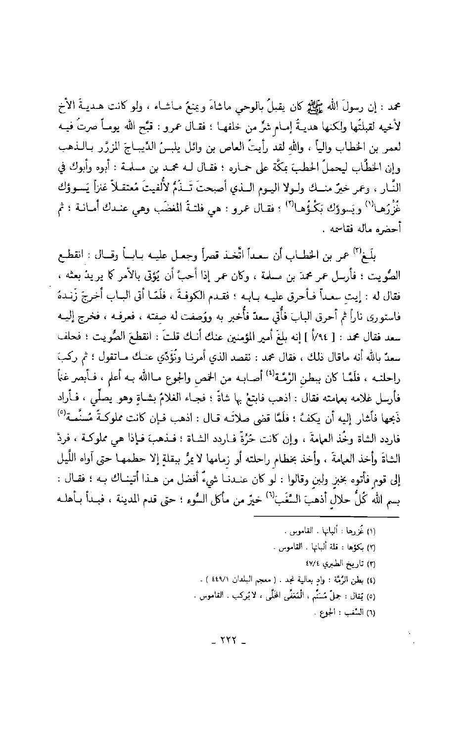 بلغ عمر بن الخطاب أن سعداً اتخذ قصراً وجعل عليه باباً وقال: انقطع الصويت؛ فأرسل عمر محمد بن مسلمة، وكان عمر إذا أحب أن يؤتى بالأمر كما يريد بعثه، فقال له: إيت سعداً فأحرق عليه بابه؛ فقدم الكوفة، فلما أتى الباب أخرج زنده فاستورى ناراً ثم أحرق الباب فأتي سعدٌ فأخبره به ووصفت له صفته، فعرفه، فخرج إليه سعد فقال محمد: إنه بلغ أمير المؤمنين عنك أنك قلت: انقطع الصويت؛ فحلف سعدٌ بالله أنه ما قال ذلك، فقال محمد: نقصد الذي أمرنا ونؤدي عنك ما تقول؛ ثم ركب راحلته، فلما كان ببطن الرمة أصابه من الخمص والجوع ما الله به أعلم، فأبصر غنماً فأرسل غلامه بعمامته فقال: اذهب فابتغ بها شاةً؛ فجاء الغلام بشاةٍ وهو يصلي، فأراد ذبحها فأشار إليه أن يكف؛ فلما قضى صلاته قال: اذهب فإن كانت مملوكةً مسنمة فاردد الشاة وخذ العمامة، وإن كانت حرةً فاردد الشاة؛ فذهب فإذا هي مملوكة، فرد الشاة وأخذ العمامة، وأخذ بخطام راحلته أو زمامها لا يمر ببقلةٍ إلا حطمها حتى آواه الليل إلى قومٍ فأتوه بخبزٍ ولبنٍ وقالوا: لو كان عندنا شيءٌ أفضل من هذا أتيناك به؛ فقال: بسم الله كل حلالٍ أذهب السغب خيرٌ من مأكل السوء؛ حتى قدم المدينة، فبدأ بأهله