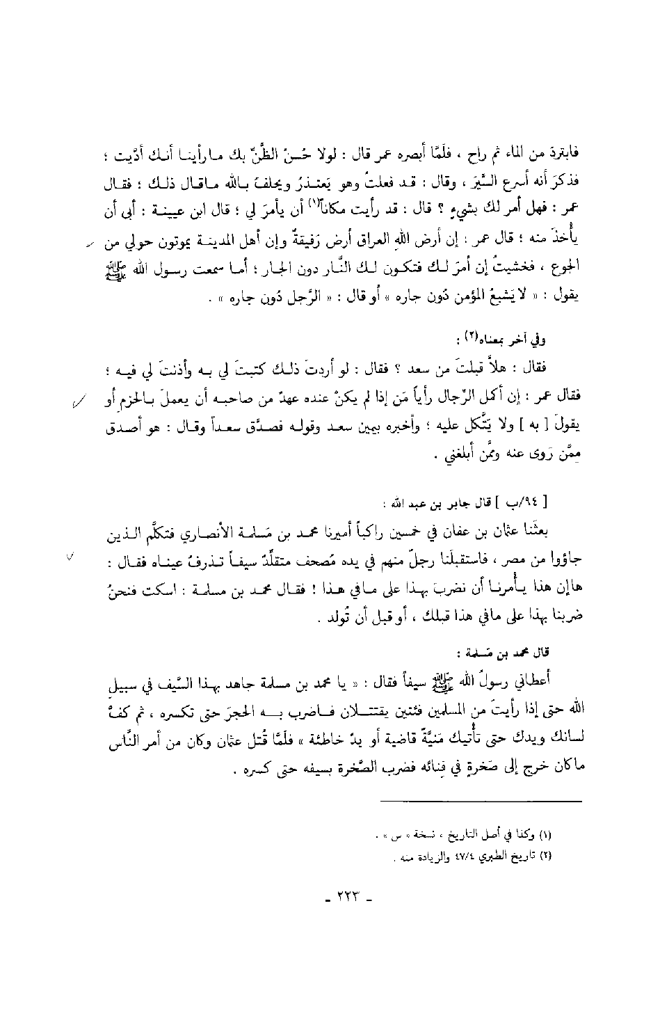 قال جابر بن عبد الله: بعثنا عثمان بن عفان في خمسين راكباً أميرنا محمد بن مسلمة الأنصاري فتكلم الذين جاؤوا من مصر، فاستقبلنا رجلٌ منهم في يده مصحف متقدٌ سيفاً تذرف عيناه فقال: ها إن هذا يأمرنا أن نضرب بهذا على ما في هذا فقال محمد بن مسلمة: اسكت فنحن ضربنا بهذا على ما في هذا قبلك، أو قبل أن تولد.